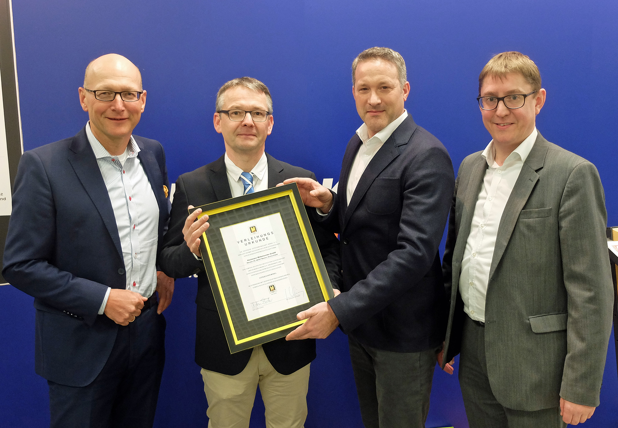 Bild: DGM-GeschĂ€ftsfĂŒhrer Jochen Winning (2.v.r.) ĂŒberreichte den Hartmann Möbelwerken um ihren GeschĂ€ftsfĂŒhrer Bernhard Hartmann (l.), Betriebsleiter Peter Hegemann (2.v.l.) und Vertriebsleiter Holger Hanhardt (r.) die Urkunde ĂŒber die Mitgliedschaft in der DGM. Foto: DGM