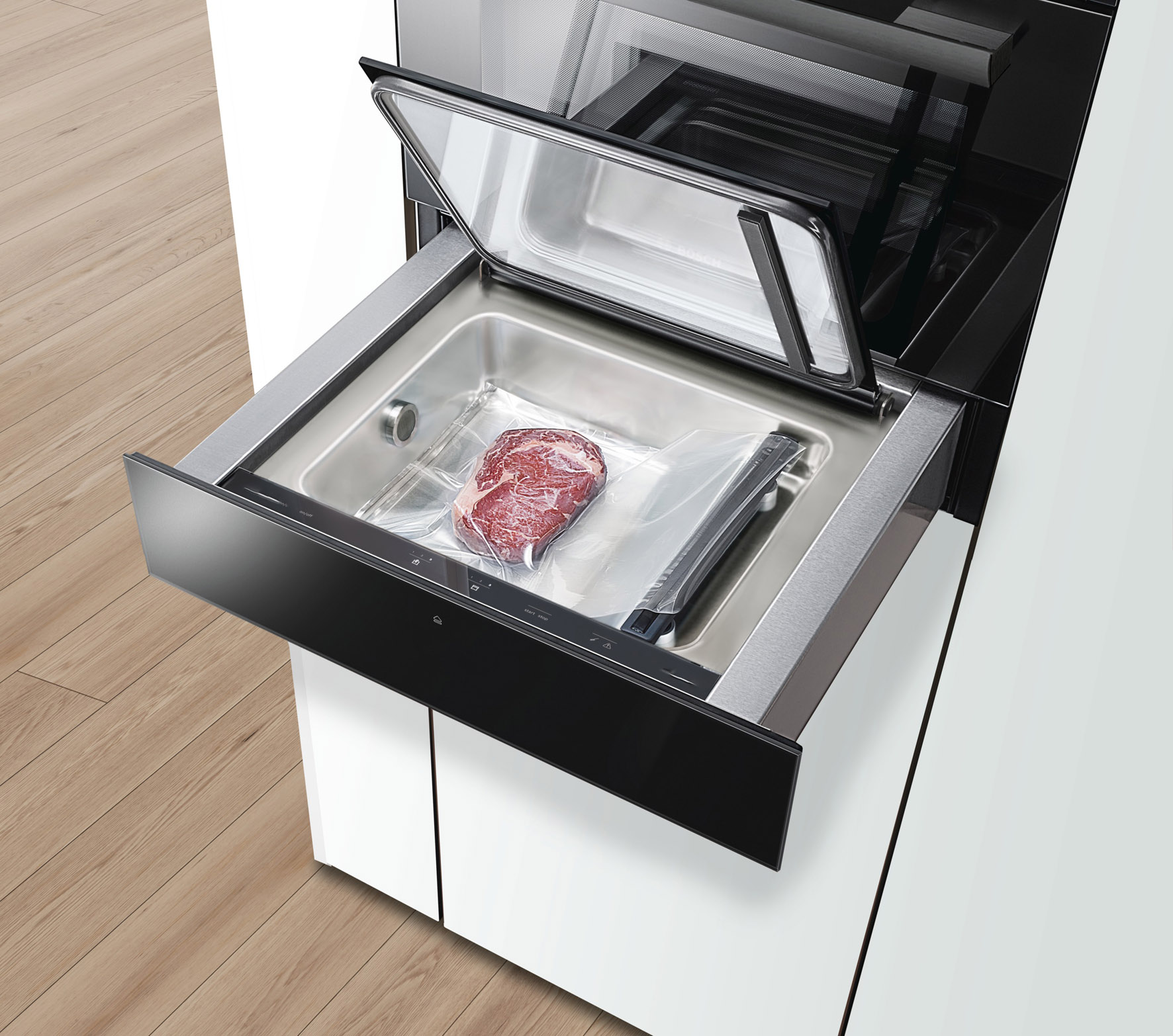 Für optimale Workflows beim aromaintensiven Garen unter Vakuum (Sous- vide) sorgt eine direkt unter dem Einbau-Dampfgarer oder Einbau-Dampfbackofen integrierte Vakuumier-Schublade. (Foto: AMK)