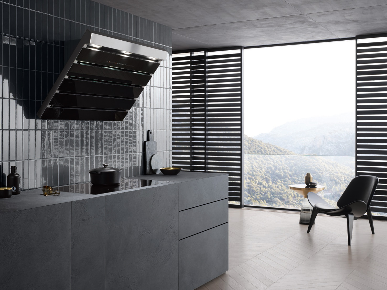 Foto 3: Hier befindet sich das Downdraftsystem direkt und nahezu unsichtbar versteckt hinter dem Kochfeld. Zum Kochen fährt der breite Haubenschirm dann aus dem Unterschrank in die Höhe, um die Kochschwaden mit einer Lüfterleistung von 750 m³/h abzusaugen. (Foto: AMK)
