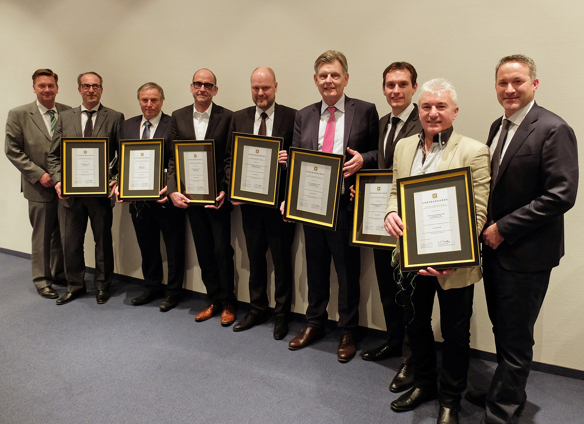 Bild: Der DGM-Vorstand um den Vorsitzenden Andreas Decker (l.) und Geschäftsführer Jochen Winning (r.) ehrte Vertreter langjähriger DGM-Mitgliedsunternehmen. Foto: DGM