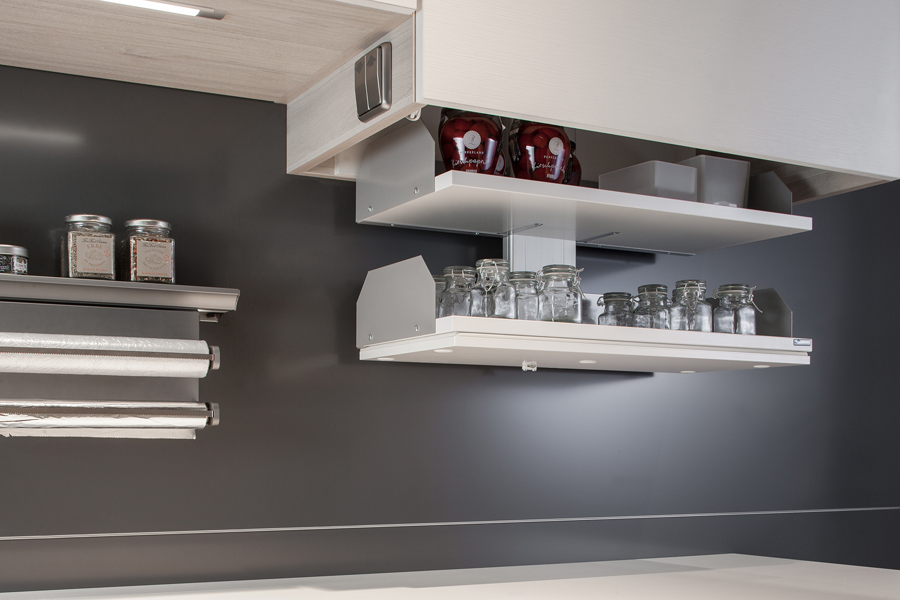 Wie der gesamte Inhalt eines etwa 80 cm hohen Hängeschranks absolut mühelos und ganz ohne Strecken und Rückendehnen erreicht werden kann, zeigen stufenlos verfahrbare Hubsäulen bzw. elektromotorisch betriebene Innenschrankliftsysteme mit hoher Hubkraft. Die gesamte Antriebstechnik ist unsichtbar eingebaut. „Das sind Technologie, Ergonomie und Bedienkomfort allererster Güte. Ganz abgesehen davon, welche Erleichterung sie für Menschen mit Problemen im Hals-, Wirbelsäulen- und Schulterbereich bedeuten oder für diejenigen, die solchen Problemen vorbeugen wollen“, sagt Kirk Mangels.