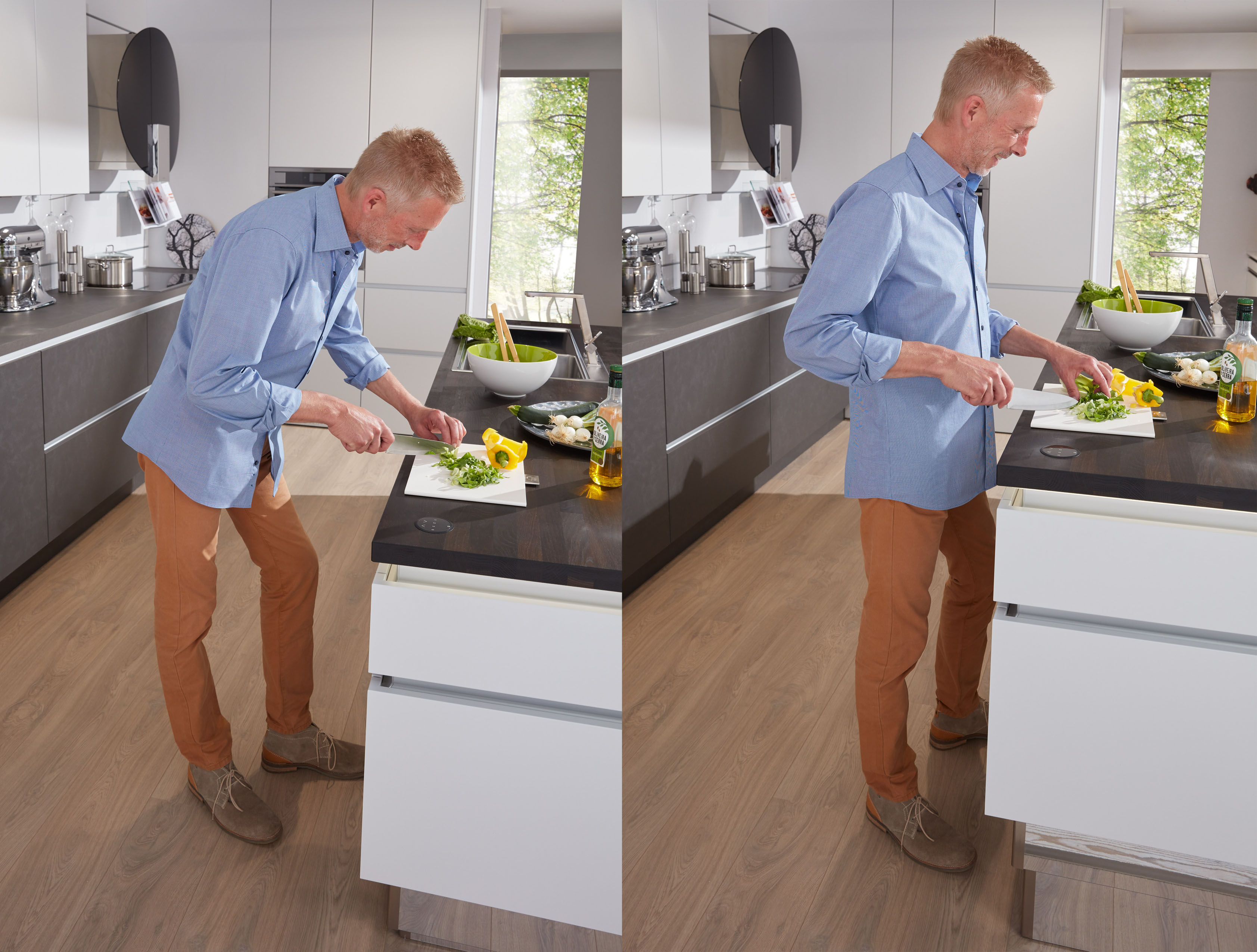Die eigene individuelle Arbeitshöhe ist das Maß aller Dinge. Dafür gibt es höhenverstellbare Arbeitsplatten, Kücheninseln und Hubmodule. Die unsichtbare Antriebstechnik steckt in der Hubsäule und im Küchensockel. (Foto: AMK)