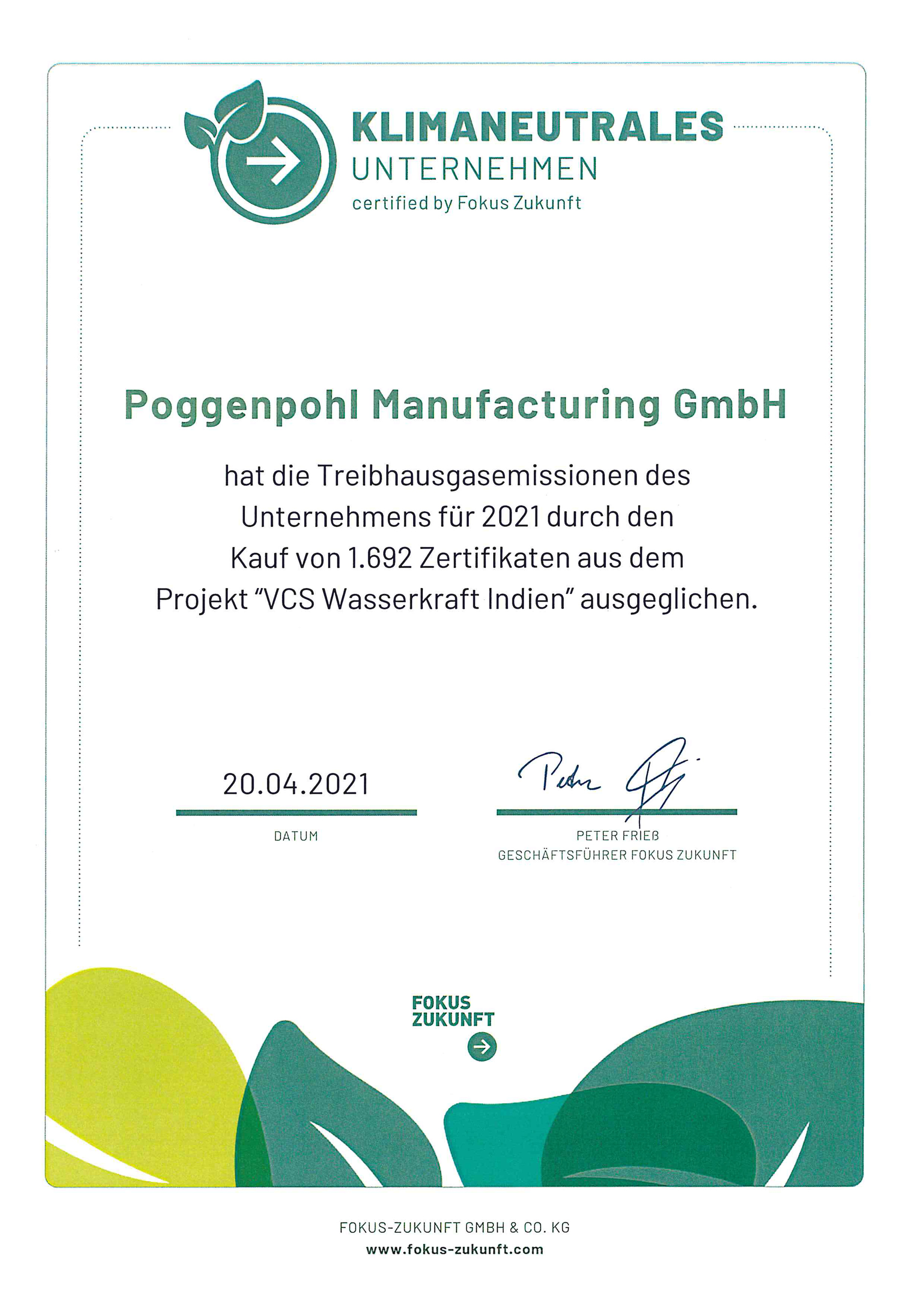 Poggenpohl hat im zurückliegenden Geschäftsjahr 1.692 Tonnen Treibhausgas verursacht. Im Rahmen der Bilanzierung wurden Einsparpotenziale für zukünftig noch klimafreundlichere Prozesse und Strukturen aufgedeckt. Für die Kompensation der festgestellten Emissionen hat das Unternehmen 1.692 Zertifikate aus einem Wasserkraftprojekt in Indien erworben. Diese Zertifikate helfen nicht nur der Infrastruktur am Projektstandort, sondern tragen auch zu einer besseren globalen CO2-Bilanz bei. „Nicht zuletzt lässt sich das Label ‚Klimaneutraler Möbelhersteller‘ von den Teilnehmern des Klimapakts auch absatzfördernd im Vertrieb einsetzen. Denn immer mehr Endverbraucher treffen ihre Kaufentscheidungen auch auf Grundlage von Nachhaltigkeitsaspekten“, schließt Winning.
