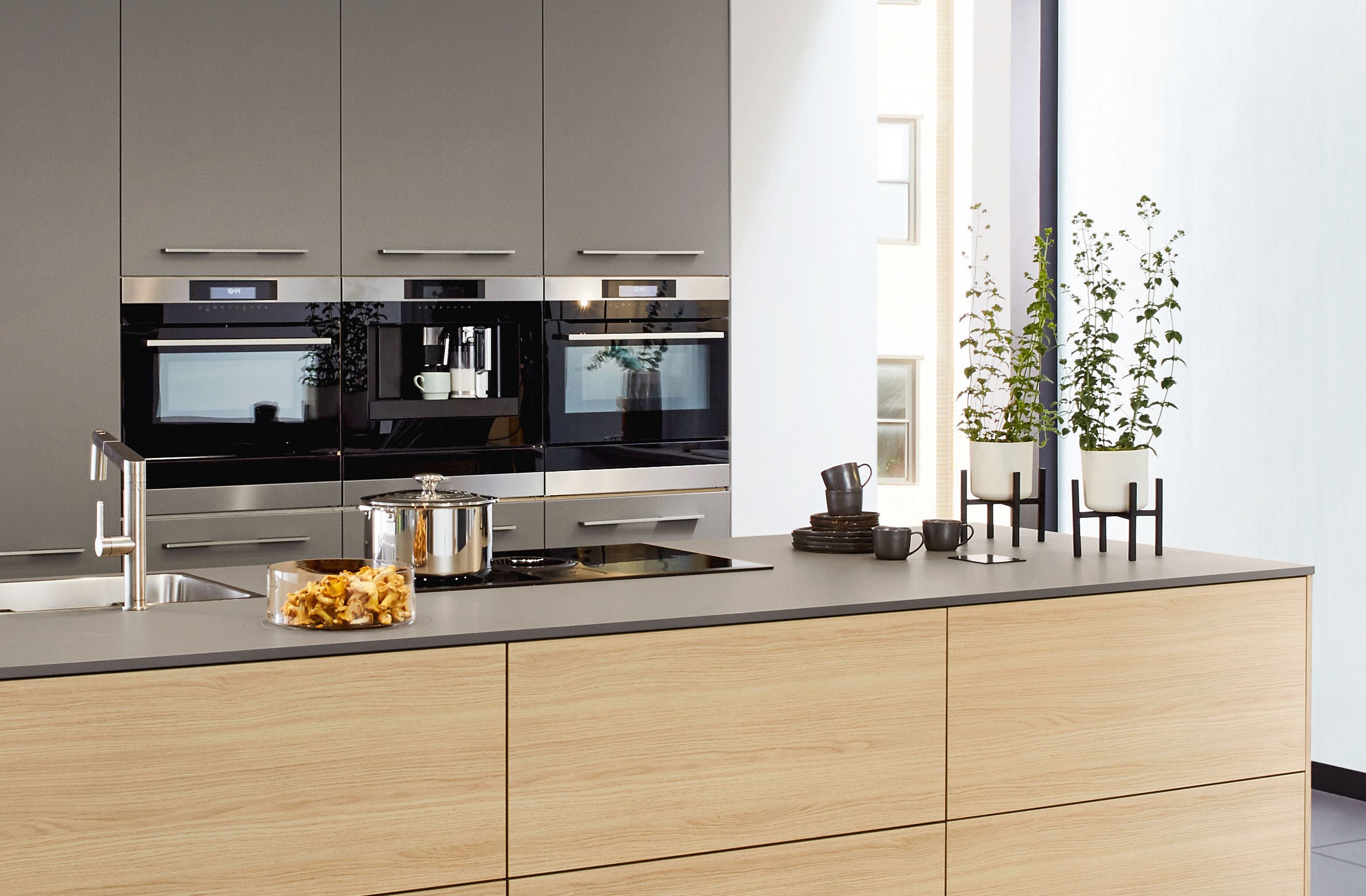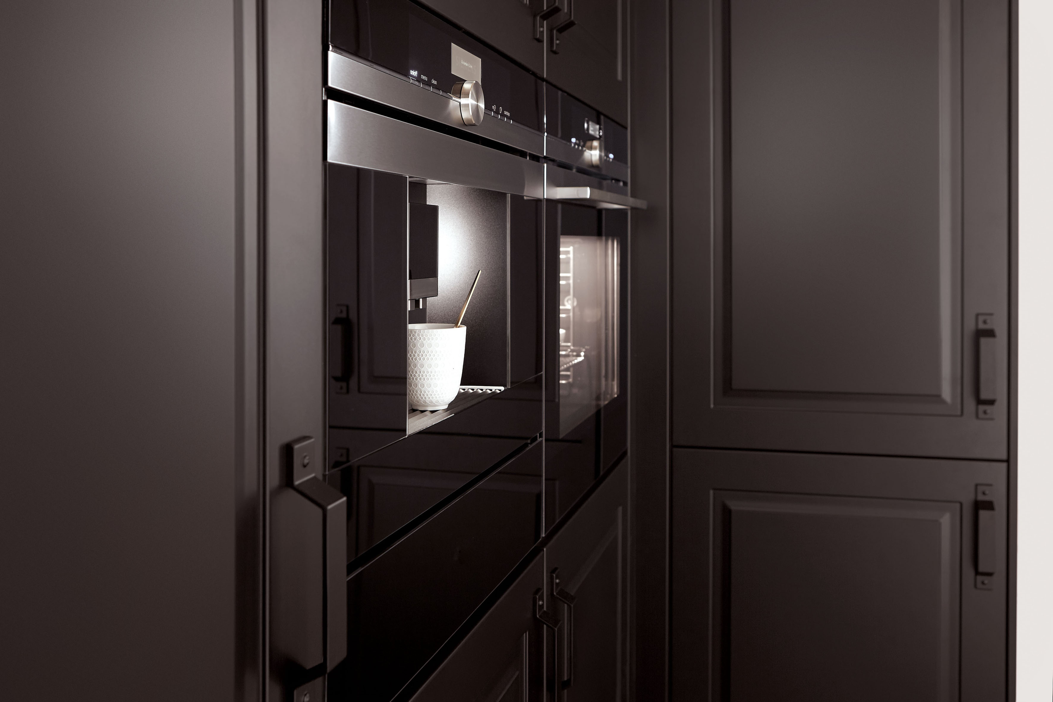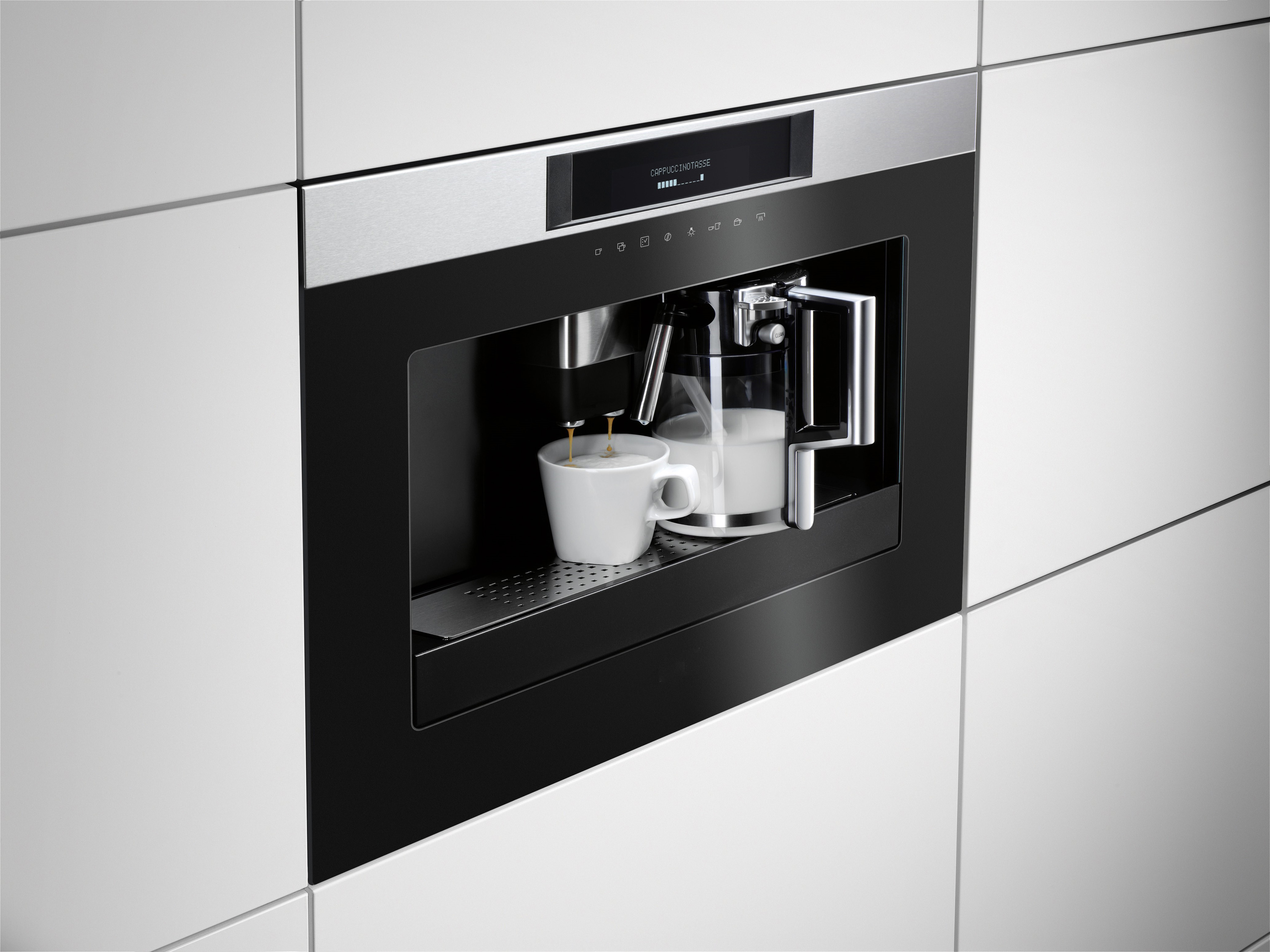 âKaffeevollautomaten, ergonomisch in Sicht- und bequemer Bedienhöhe eingebaut, sind ein Gewinn in jeder KĂŒcheâ, sagt Volker Irle. Entweder als schickes Solo-EinbaugerĂ€t fĂŒr eine 45 cm hohe Möbelnische oder zusammen mit anderen KompaktgerĂ€ten in einer Reihe neben- oder ĂŒbereinander eingebaut (z. B. zusammen mit einem Kompakt-Backofen und -Dampfgarer). Sollte Platz fĂŒr eine 60-cm-Nische sein, dann in Kombination mit einer attraktiven WĂ€rmeschublade direkt unter dem Vollautomaten. Darin lassen sich dann, ganz nach Barista-Expertise, die Kaffeetassen und GlĂ€ser stilvoll vorwĂ€rmen.