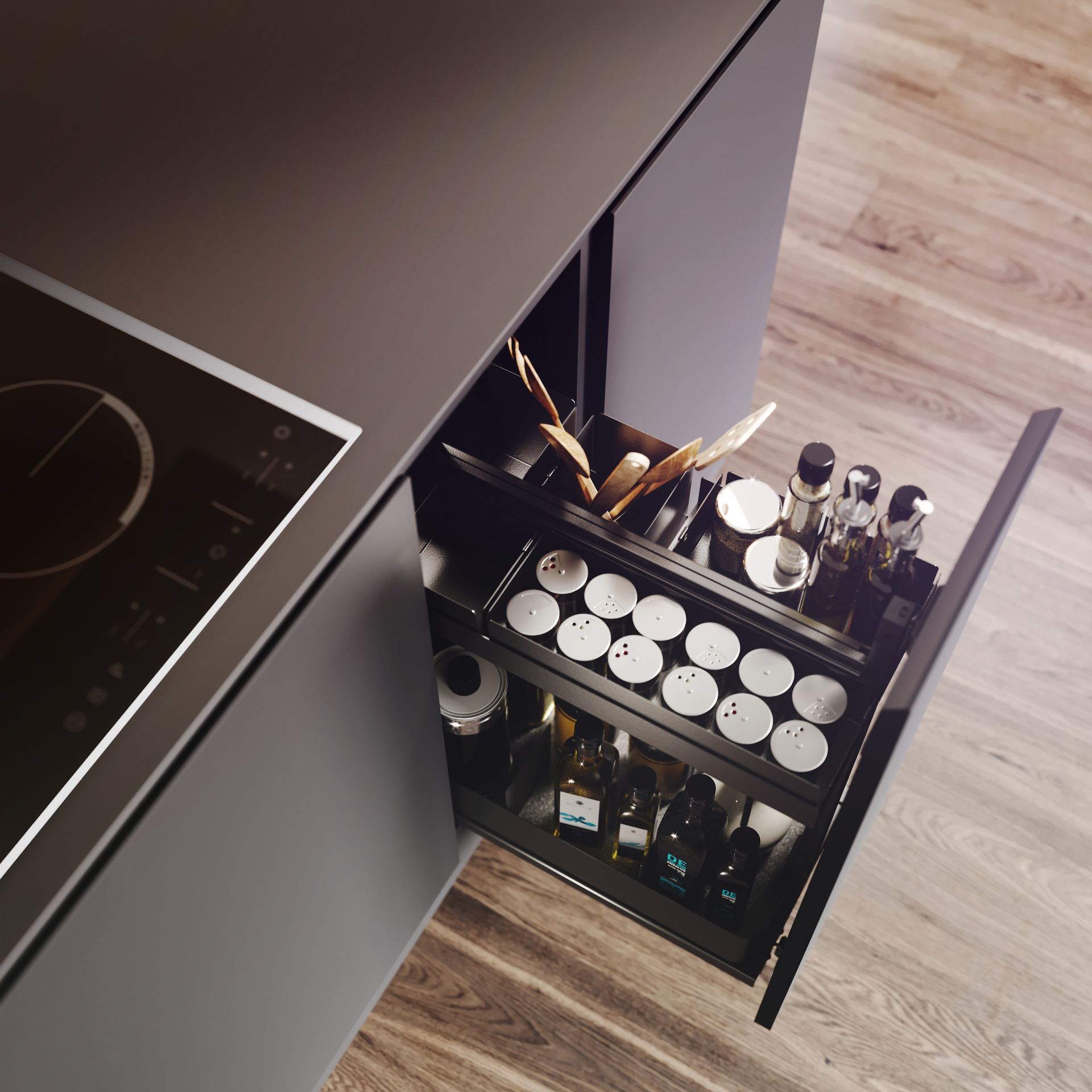 Ein praktischer, schmaler Auszug ist nahe beim Kochfeld ideal für Essige, Öle und Kräuter. (Foto: AMK)Â