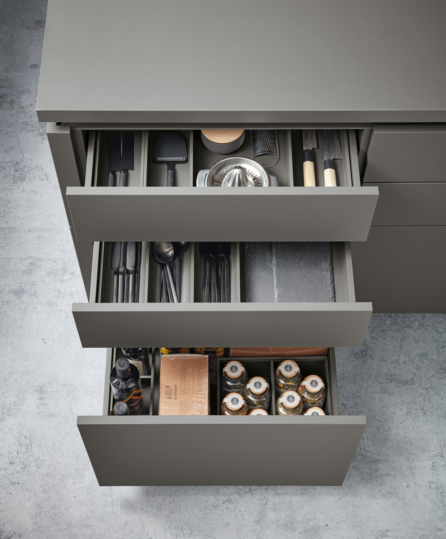 Einen guten Überblick über den Schrankinhalt bieten auch Hochschränke. „Intelligente Auszüge sorgen dabei für einen schnellen Zugriff auf die Vorräte“, sagt Irle und verweist auf die Variantenvielfalt. So bieten die Küchenhersteller etwa Hochschränke an, bei denen sich mit Öffnen der Tür die Körbe oder Schubladen automatisch nach vorne vor den Schrank bewegen. Bei anderen Modellen können die Schubladen einzeln herausgezogen werden. Wegen des umfangreichen Stauraums sind Hochschränke gerade auch für kleine Küchen zu empfehlen. Als wahre Stauraumwunder gelten zudem Eckschränke, bei denen ein Tablarauszug den Inhalt komplett heraus fährt.