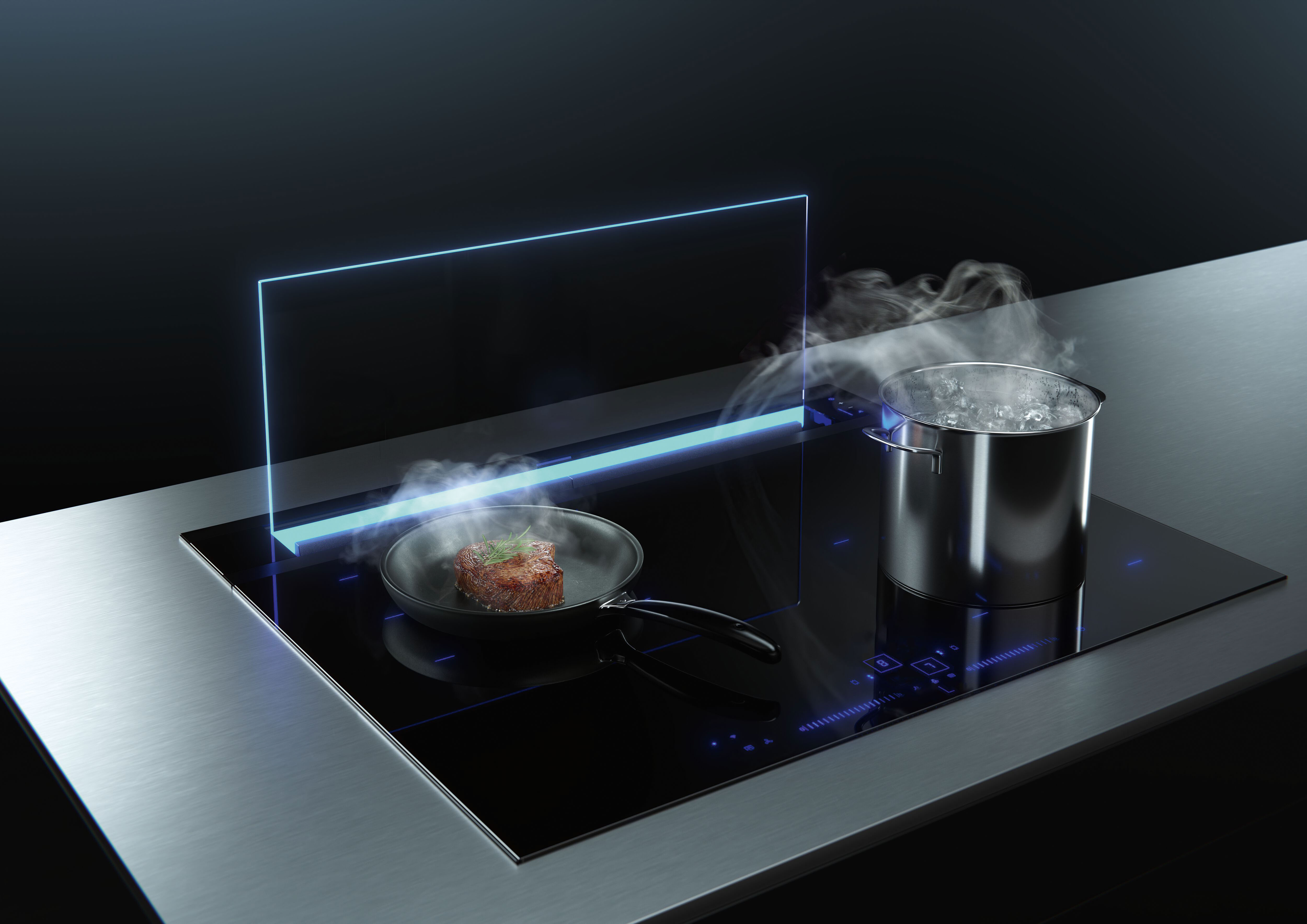 Elegante Tischlüftung für offene Wohnküchen. Ihre Farbe kann per App variiert werden. Wird nicht gekocht, verbirgt sich der schlanke Glasschirm hinter dem Kochfeld im Unterschrank. Zum Kochen fährt er aus der Arbeitsplatte in die Höhe und saugt die Kochschwaden effizient ab. (Foto: AMK)