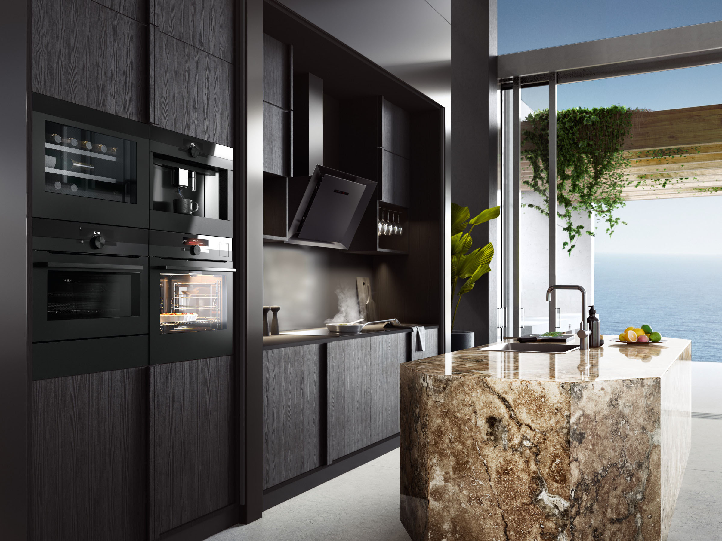 Minimalistisch-zeitloses Design in Schwarz matt mit Antifingerprint-Eigenschaften. Für Kocherlebnisse sorgen innovative Einbaugeräte wie z. B. ein kompakter Weinkühlschrank, Kaffeevollautomat, vernetzter Backofen mit Mikrowelle und ein smarter Multidampfgarer mit Sous-Vide-Funktion. (Foto: AMK)