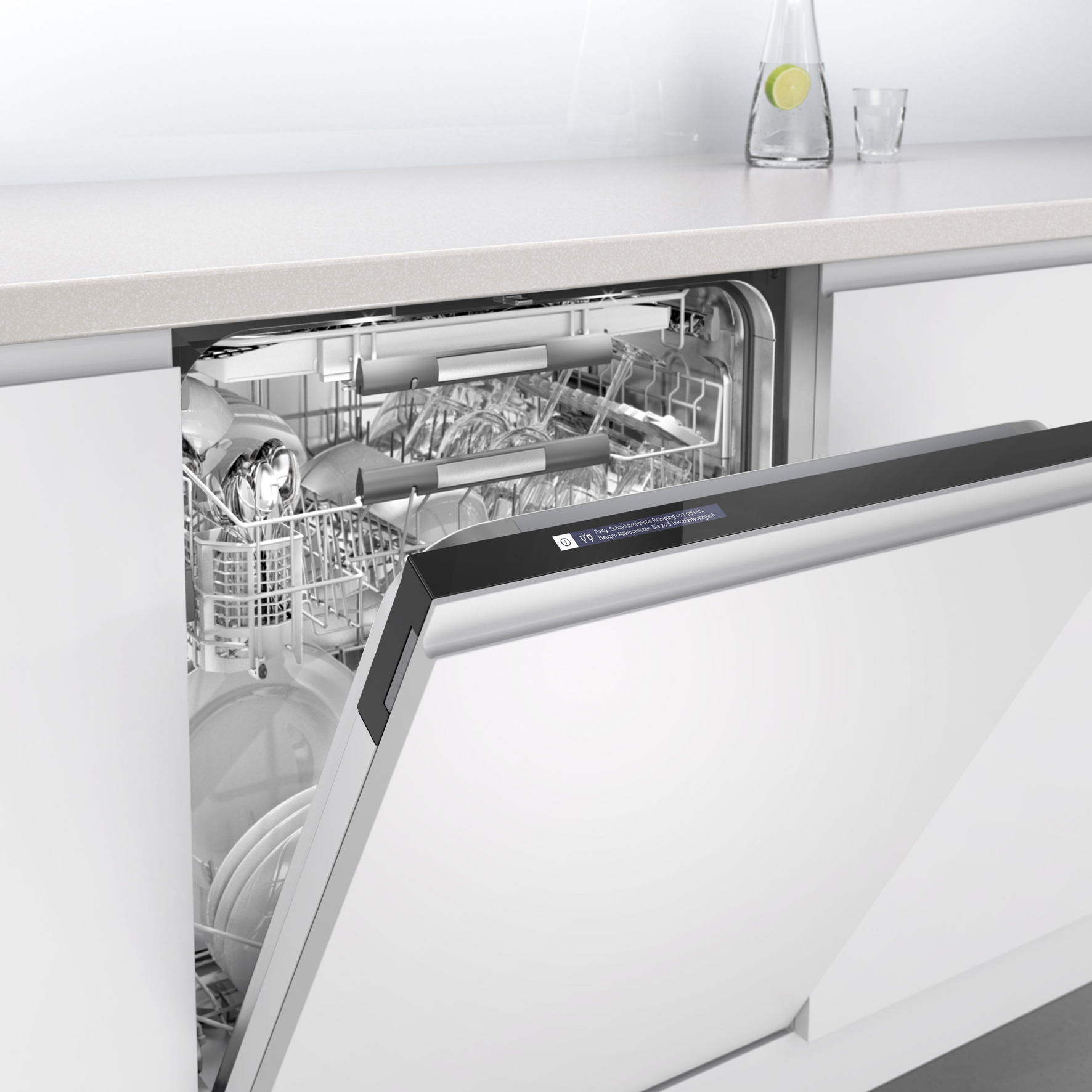 Superschnell, energieeffizient (A+++ - 20%), ergonomisch und vernetzbar: Die Bedienung erfolgt per TouchControl. Im Schnellprogamm ist das Geschirr nach 20 Minuten wieder einsatzbereit – im Party-Programm schon nach 11 Minuten. Nach der Trocknung sorgt reiner Dampf für Glanz. (Foto: AMK)