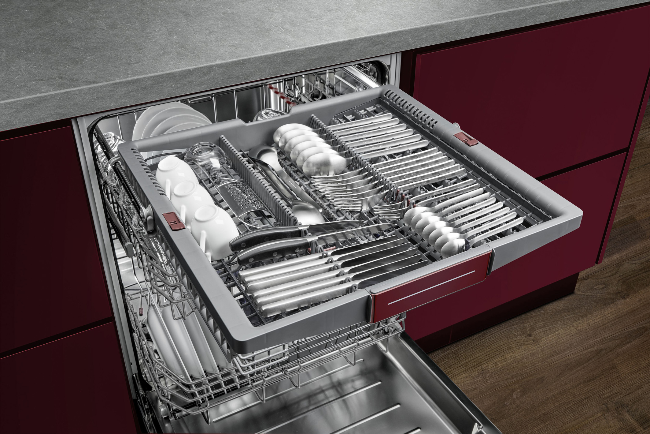 Dieser smarte Spüler bietet sehr flexible Korblösungen und Ausstattungsmerkmale: z. B. für die oberste Ebene eine Besteckschublade oder einen Korb für kleine, sperrige Gegenstände. Neu ist auch die Memory-Funktion zum Speichern eines Lieblingsprogramms plus einer zusätzlichen Option. (Foto: AMK)