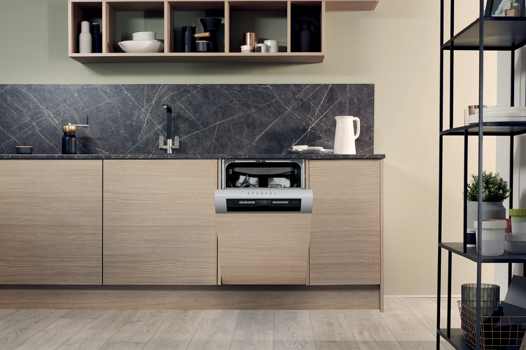 Mit diesem vollintegrierten, 45 cm breiten Spüler ist normal verschmutztes Geschirr in weniger als 1 Stunde wieder einsatzbereit. Bei Wahl des Automatik-Programms erzielt man beste Reinigungsergebnisse schon ab 6,5 l Frischwasser. Restlos trocken ist alles durch die automatische Türöffnung. (Foto: AMK)