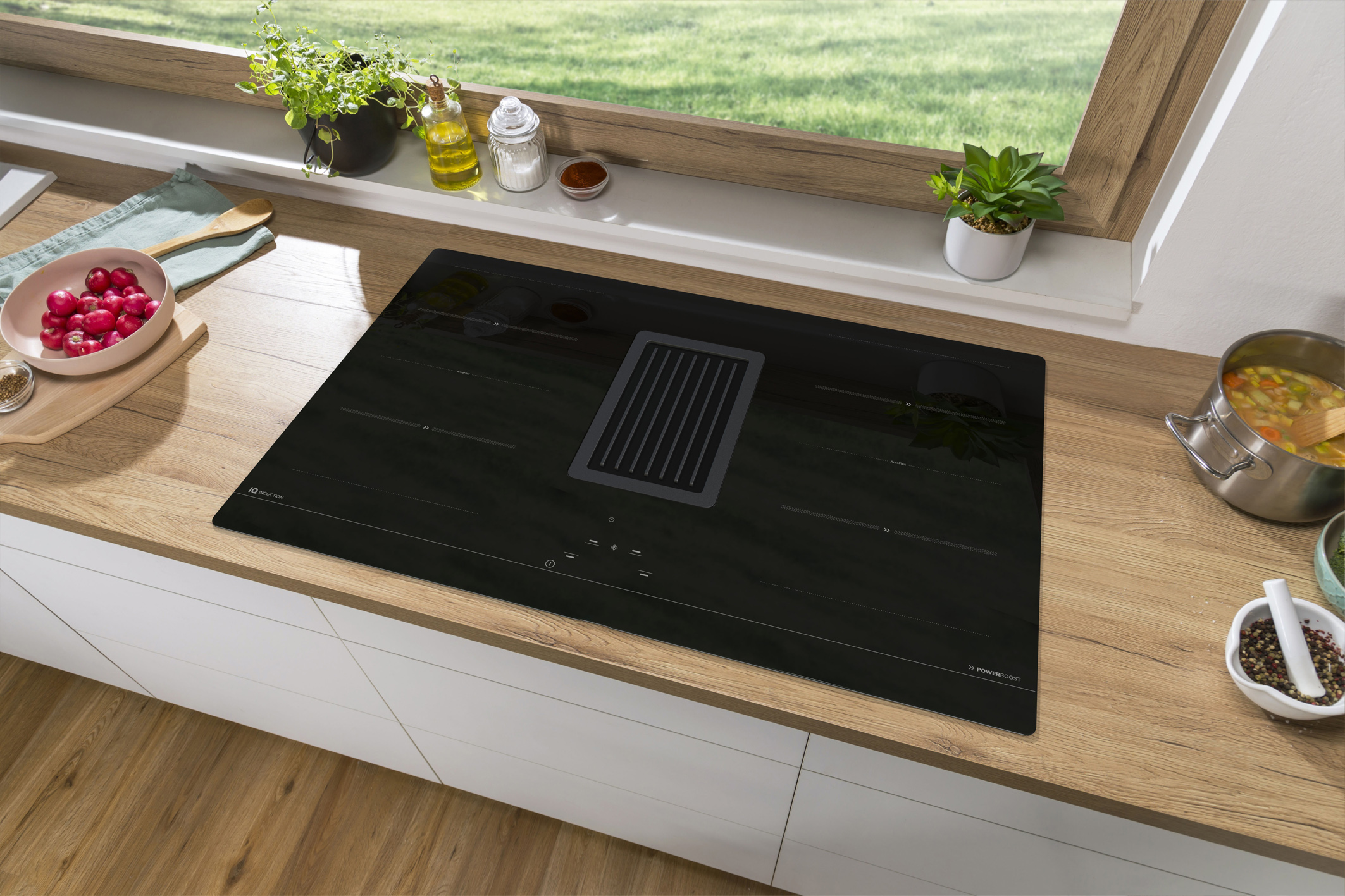 Dieses Induktionskochfeld mit integriertem Muldenlüfter ist u. a. mit einem vordefinierten Temperaturmanager zum Sieden (92 °C), Warmhalten (74 °C) und Schmelzen (42 °C) sowie einer automatischen Aufheiz-Funktion ausgestattet – damit das Kochgeschirr sein optimales Hitze-Level erreicht. (Foto: AMK)