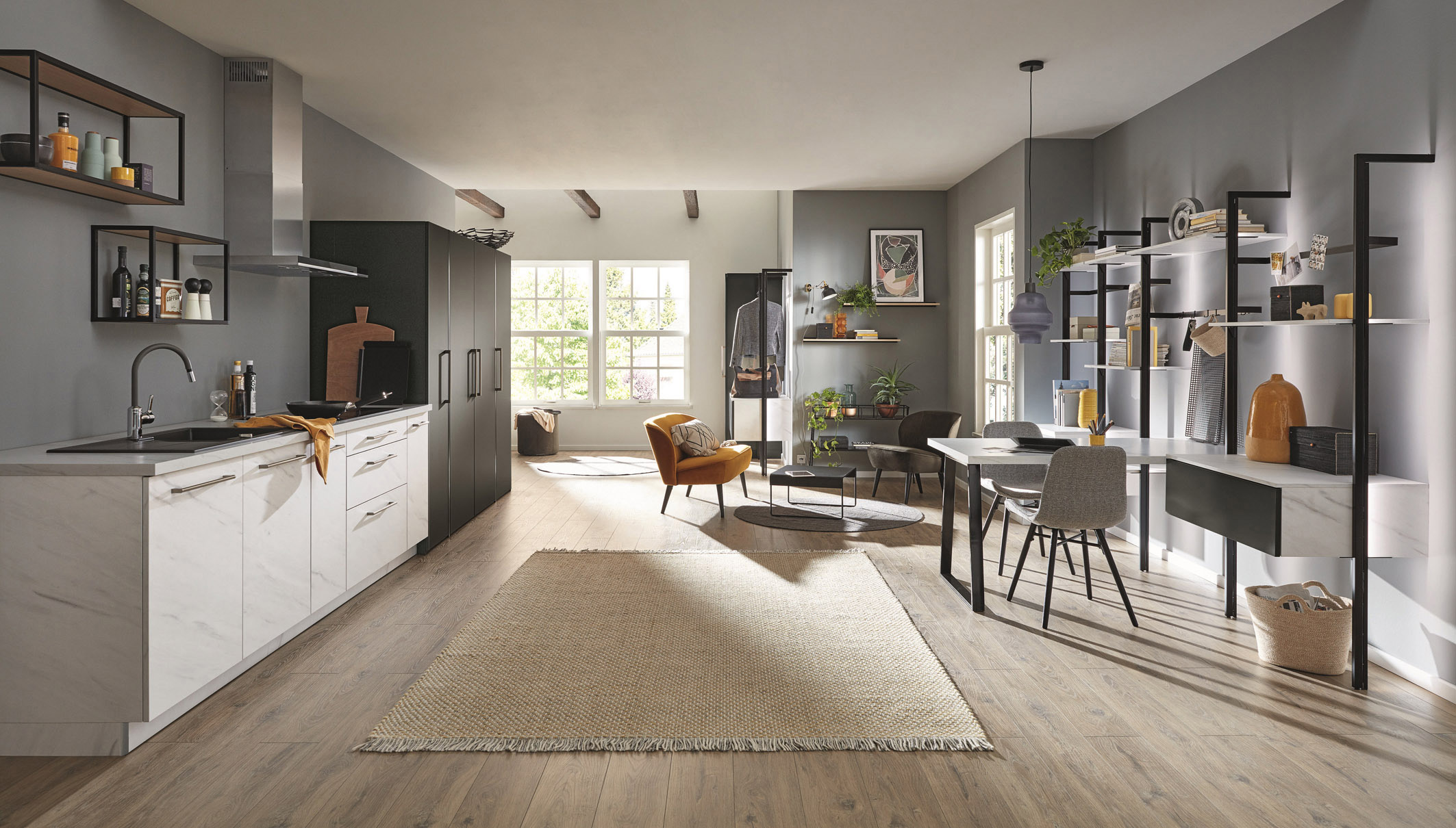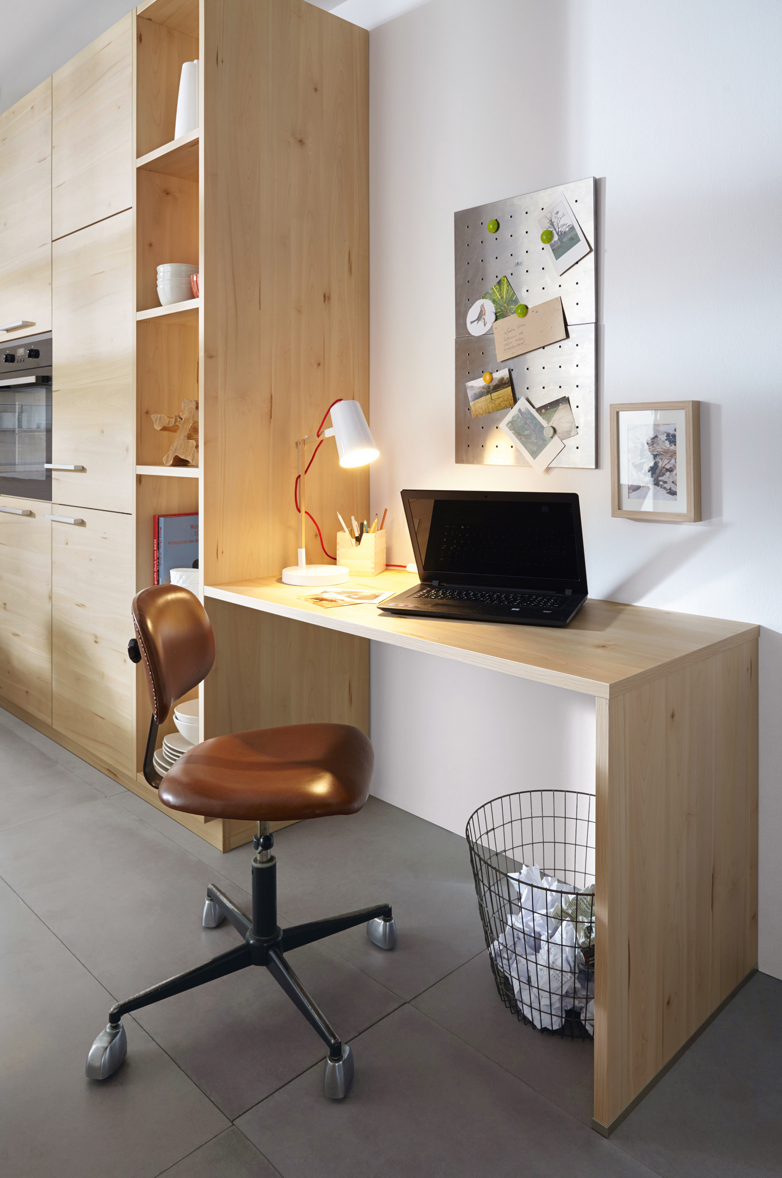 Komfortables Arbeiten in der Küche wird auch durch zierliche Schreibtische möglich, die sich etwa an eine Hochschrank-Küchenzeile andocken lassen. Dank einer einheitlichen Front fügt sich der Arbeitsplatz optisch ansprechend in die Küche ein – oder auch in den Übergang zum offenen Ess- und Wohnbereich. So wird ein ruhiges Plätzchen zum Arbeiten geschaffen. Â