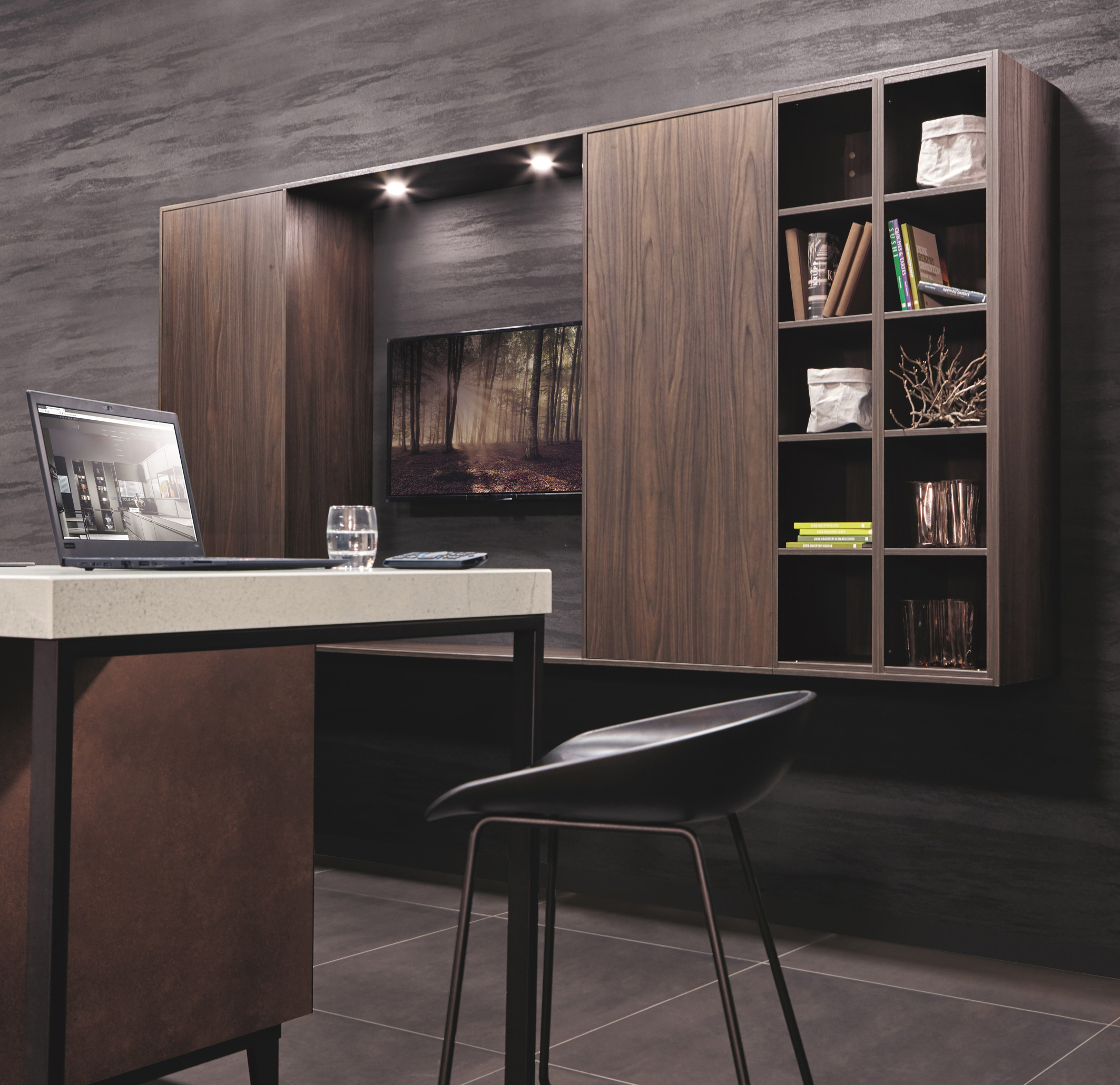 Eine weitere attraktive Homeoffice-Lösung für die Küche besteht darin, die Arbeitsplatte seitlich oder auch rechtwinkelig über die Unterschränke hinaus zu verlängern und auf diese Weise einen Schreibplatz zu schaffen. Oder es wird auf ein bis zwei Unterschränke verzichtet und die Arbeitsplatte an dieser Stelle unkompliziert als Homeoffice genutzt. Einfügen lässt sich der Arbeitsplatz auch in eine Hochschrankzeile. Auf dem Unterschrank wird ein Auszugsboden montiert, der sich zur Schreibplatte herausausziehen lässt. Die Büroutensilien können über dem Arbeitsplatz in diversen Fächern verstaut werden. Unter den Regalen sind Lampen eingebaut – damit ist für eine angenehme Beleuchtung des Arbeitsbereichs gesorgt. Möglich wird mobiles Arbeiten auch durch eine Verlängerung der Kücheninsel. Auf diese Weise lässt sich Platz und Komfort für einen temporären Büroplatz schaffen.