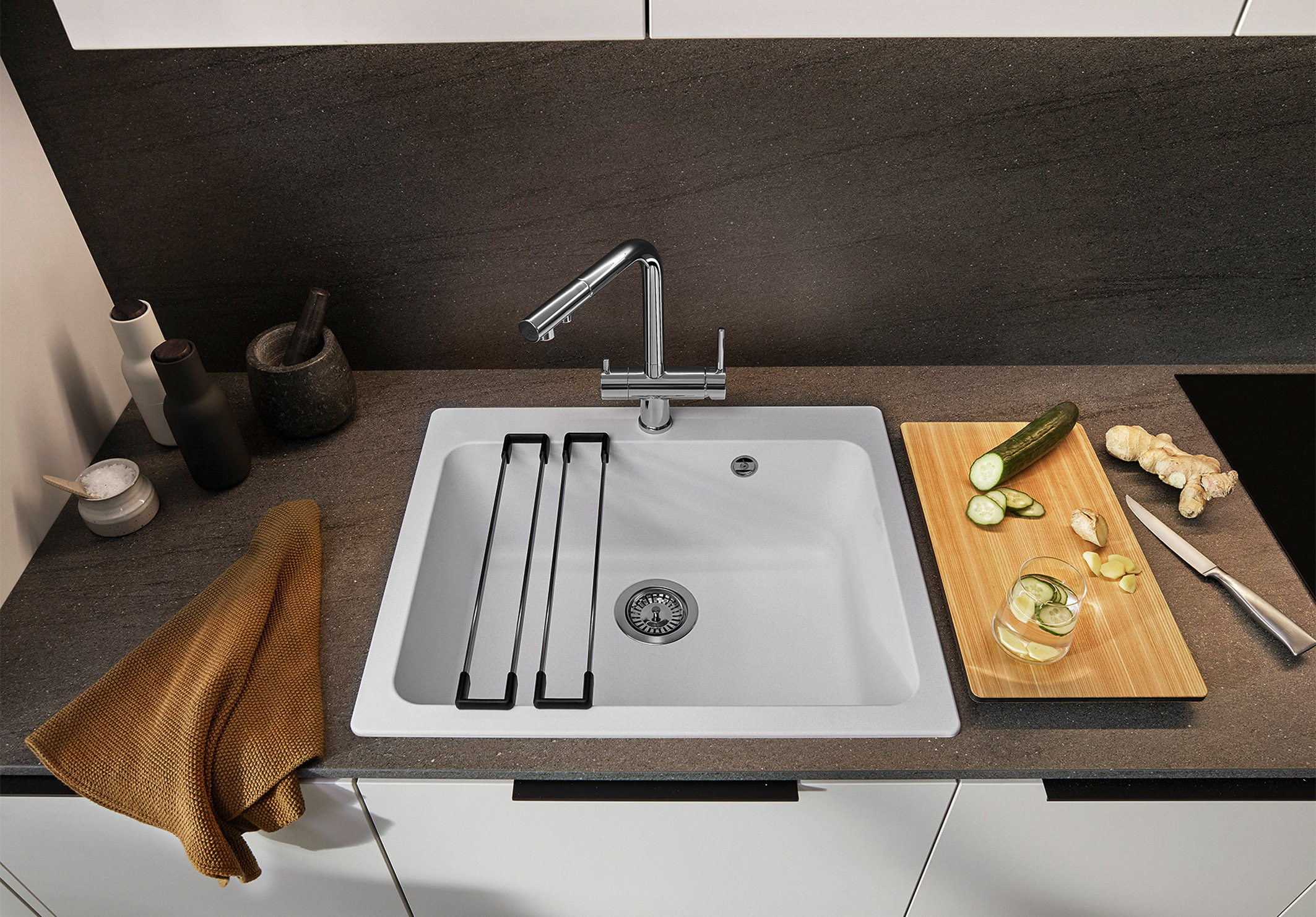 Ein dritter starker Hingucker neben hochwertigen Marken- und Design-Modellen in Edelstahl oder Keramik sind Granit-Spülen aus Quarzkomposit. Der innovative Verbundwerkstoff zeichnet sich durch einen sehr hohen Anteil (80 Prozent) an natürlichem Quarzsand aus, dem härtesten Bestandteil von Granit. Im Gegensatz zu kühlem Granitgestein fühlen sich die glatten Oberflächen dieser eleganten Spülen angenehm temperiert an. Gleichzeitig sind sie extrem hart und daher sehr strapazierfähig und kratzfest. Granitspülen sind farb- und UV-beständig, bruchfest, unempfindlich gegenüber Kälte, Hitze und küchenüblichen Säuren sowie reinigungsfreundlich. Wird auf besondere Hygiene Wert gelegt, dann kommt eine Spüle mit zusätzlicher antibakterieller Oberflächenveredelung infrage. Aufgrund des großen Angebots an attraktiven bis hin zu außergewöhnlichen Farbstellungen findet sich für jedes Küchendesign das passende Modell. Und wer eine besonders nachhaltige Granitspüle sucht, der wird auch in dieser Disziplin fündig: z. B. eine Spülenmaterialität, die zu 99 Prozent aus natürlichen, nachwachsenden oder recycelten Rohstoffen besteht und nach einem langen Lebenszyklus wieder in einen geschlossen Recycling-Kreislauf zurückgeführt werden kann.
