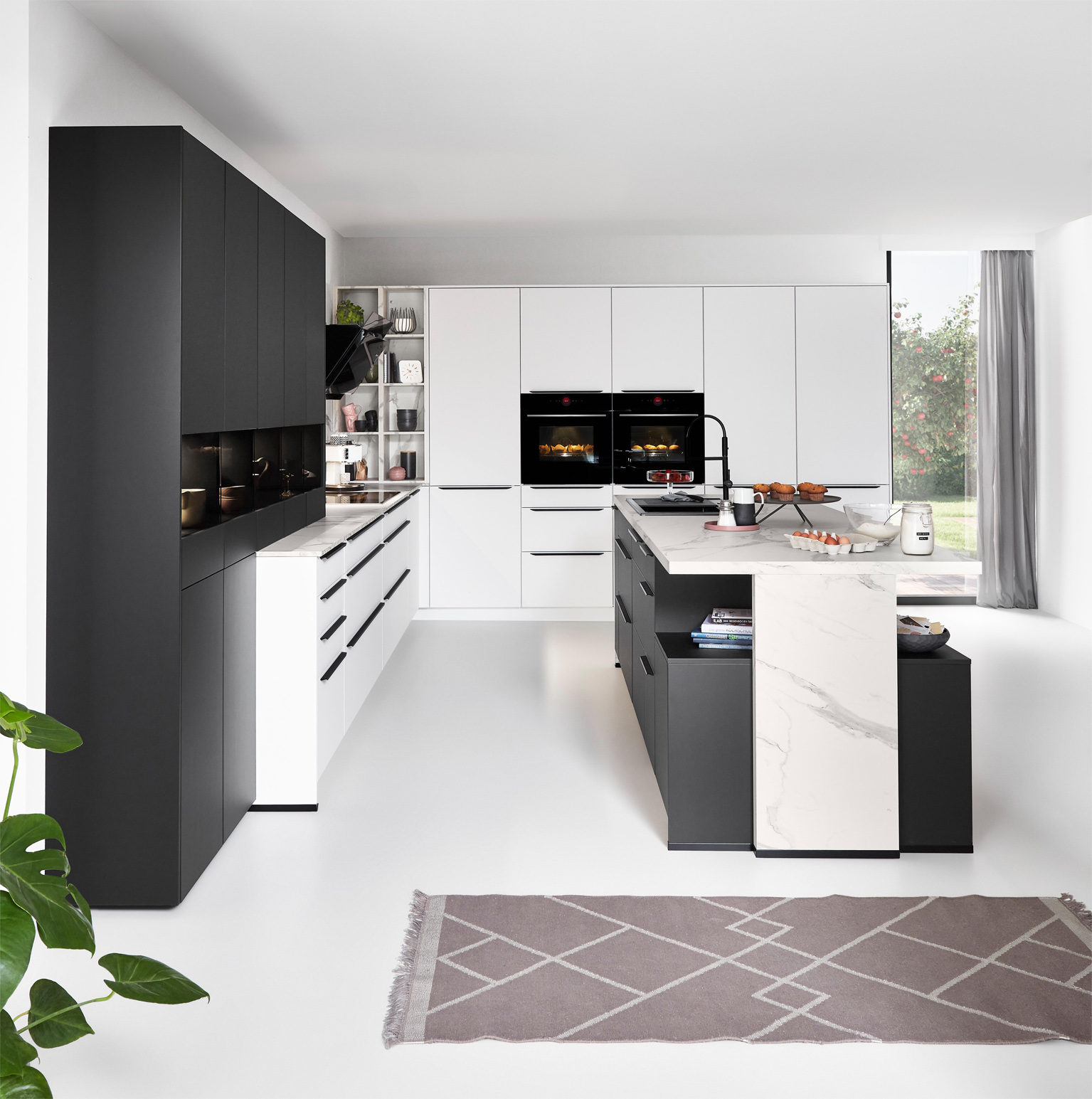 Bild 2: Maximalkontraste: Diese schönen Fronten in Weiß und Graphitschwarz sind dank Antifingerprint-Beschichtung extra pflegeleicht, einfach zu reinigen und sehr widerstandsfähig. Ein weiteres Highlight ist die großflächige Marmoroptik der Arbeitsplatte und Wange als eleganter Abschluss der Insel. (Foto: AMK)