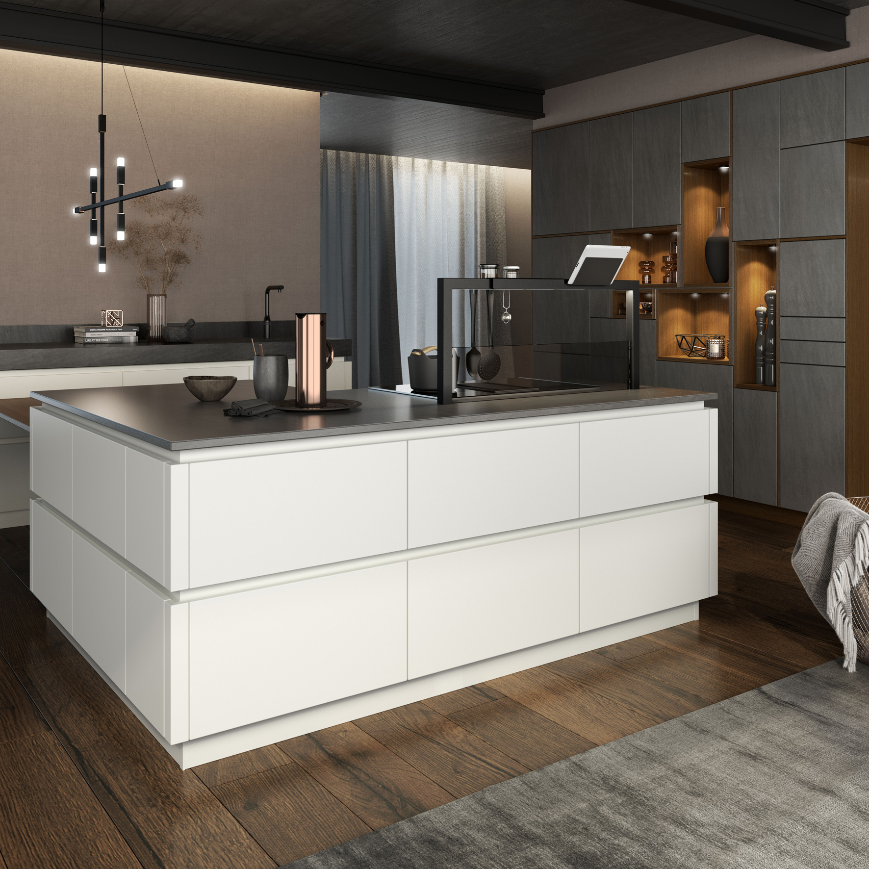 Eine weitere Attraktion ist polymeres Glas – auch als Smartglas, Crystalglas oder Glaslaminat bezeichnet. Diese Innovation sieht genauso aus wie echtes Glas, ist dagegen jedoch kratzfester, bruchfester und unempfindlich gegen Fingerabdrücke. Sehr vornehm nimmt es sich in matter Ausführung in den Farbstellungen Grau, Sand, Schwarz, gebrochenem Weiß und Magnolia aus. Soll die Wohnküche dagegen in einer kühlen Farbpalette geplant werden, dann in Platin, Titan oder Silber.