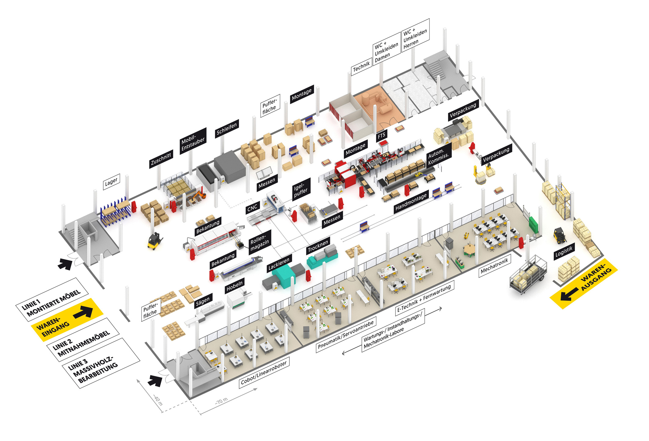 In der Lehrfabrik Möbelindustrie wird auf einer Bruttonutzfläche von knapp 3.300 Quadratmetern der gesamte Produktionsprozess eines typischen möbelverarbeitenden Unternehmens zum Zweck der Ausbildung, Umschulung und Weiterbildung abgebildet. Von 2024 an sollen Bildungsmodule für sechs Berufsbilder angeboten und rund 200 Nachwuchskräfte im Jahr aus- und weitergebildet werden.