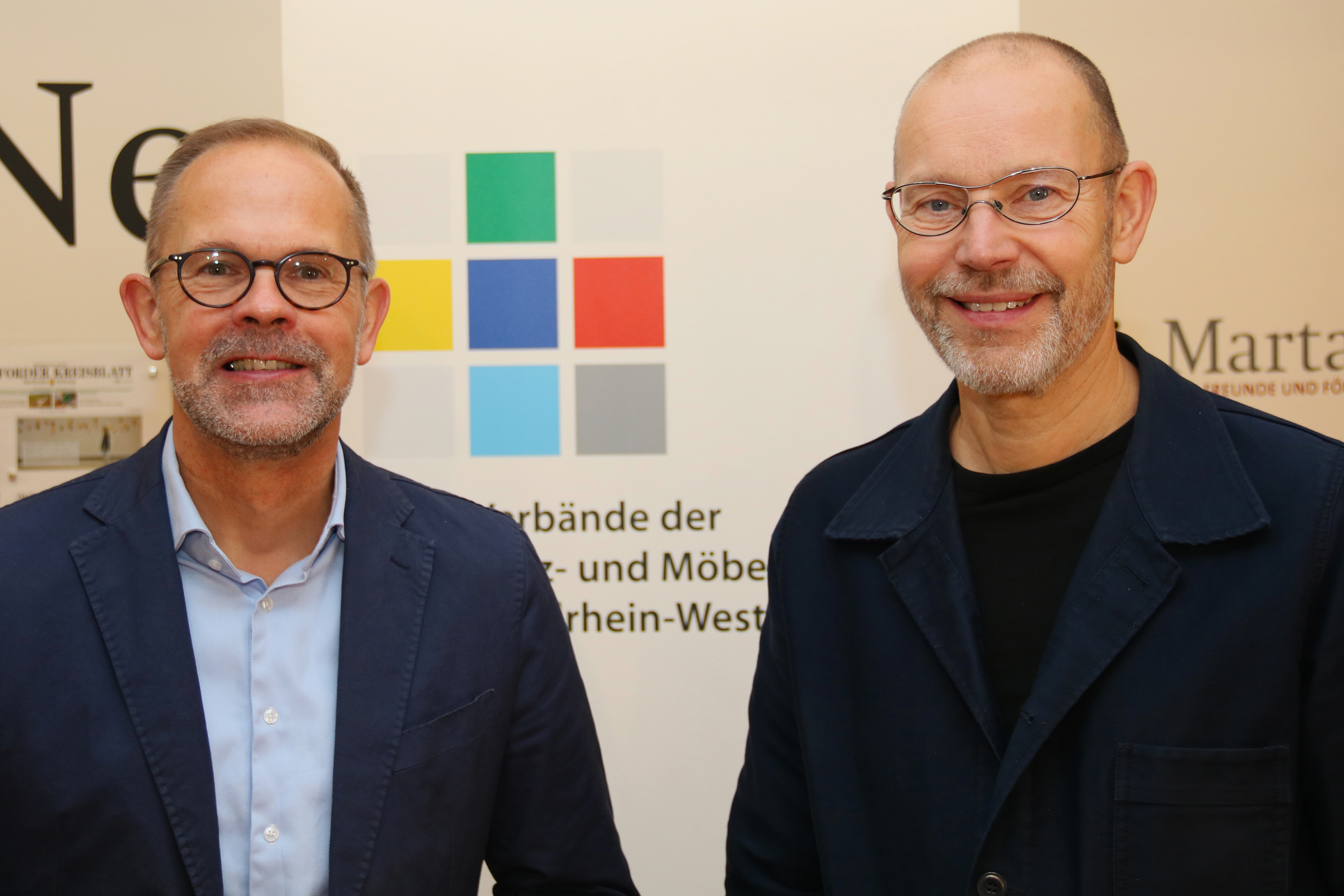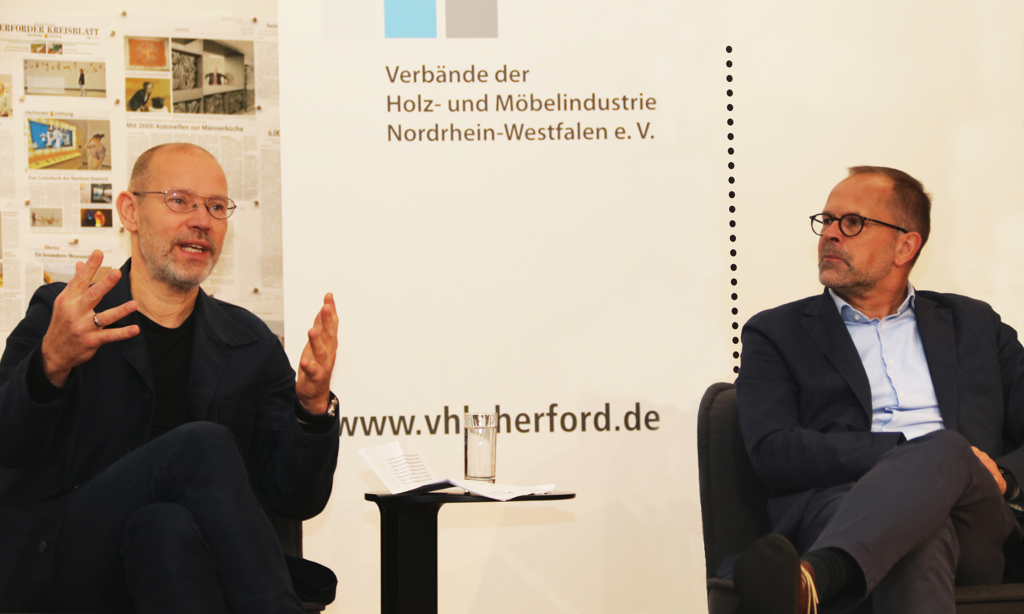 vhnd2321_b1: VdDP-Vorstandsvorsitzender Leo Lübke (li.) und Geschäftsführer Jan Kurth berichten am 20. September in Herford zur Lage der deutschen Polstermöbelindustrie.