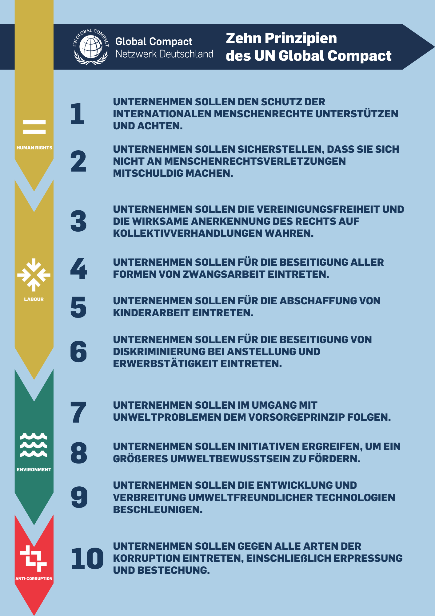 Die Zehn Prinzipien für nachhaltige Unternehmensführung des UN Global Compact.