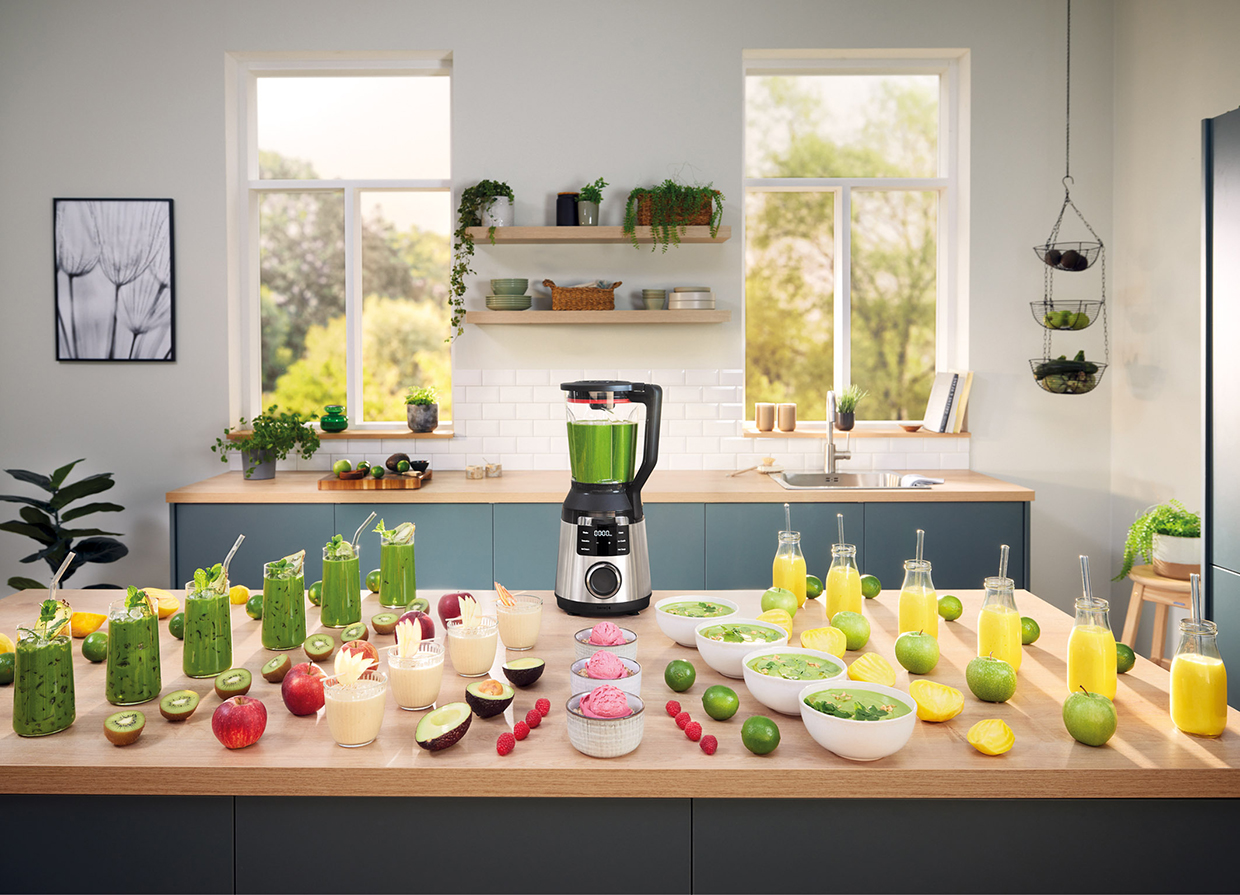 Bild 6: Bringt mit 1.800 Watt und bis zu 45.000 U/Min. Power in die Küche und liefert selbst bei harten Zutaten samtige Konsistenzen. Smoothies können auch direkt in der To-Go-Flasche gemixt werden. Der Mixer erkennt automatisch den Aufsatz und passt die Automatikprogramme entsprechend an. (Foto: AMK)Â