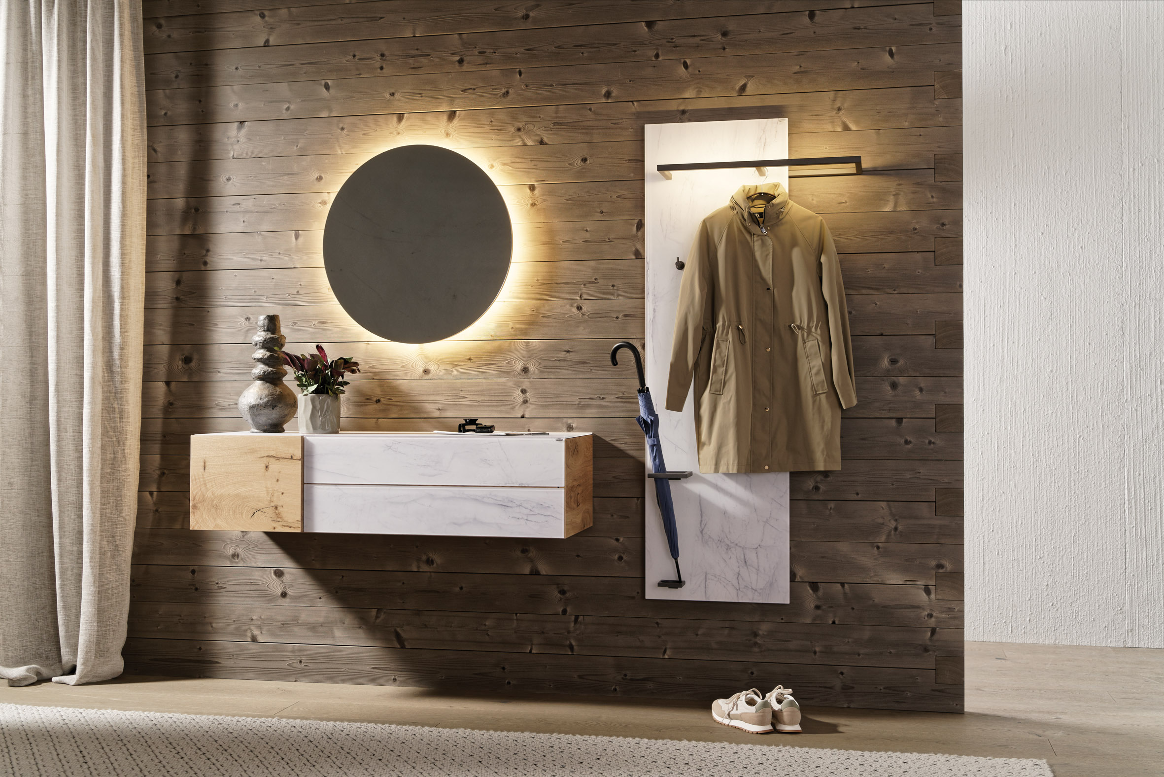 Bild 1: Da der Eingangsbereich oftmals klein und schlicht gehalten ist, müssen die Massivholzmöbel kompakt sowie funktional sein und sollten dennoch Wärme als auch Gemütlichkeit ausstrahlen. Foto: IPM/Voglauer