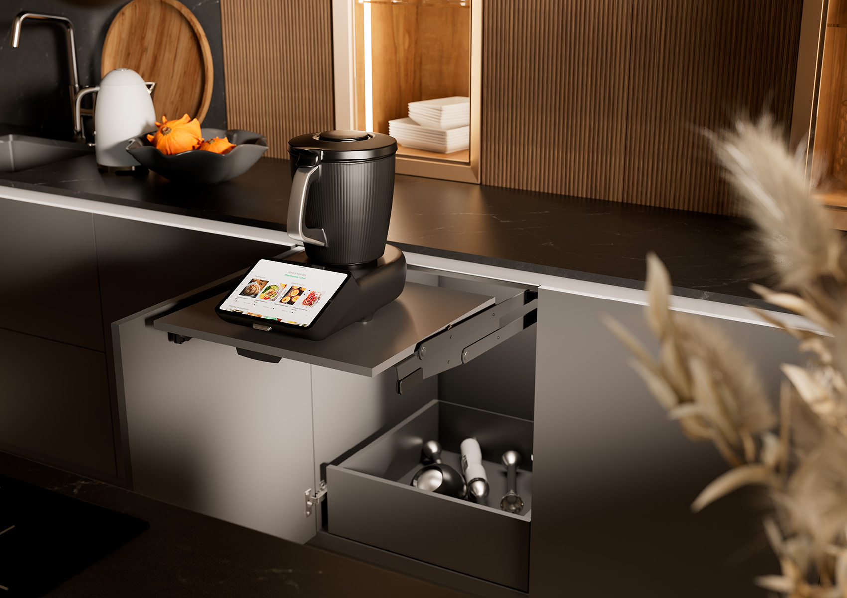 Nur ein kleiner Handgriff ist nötig, um die Küchenmaschine oder Heißluftfritteuse aus dem speziell ausgestatteten Unterschrank mit einem Schwung direkt auf Arbeitshöhe zu bringen. Möglich macht dies eine besonders belastbare Ausschwenkmechanik, die ein mit bis zu 19 Kilogramm Gewicht beladbares Tablar samt Küchengerät auf das Niveau der Arbeitsplatte befördert. Die Nutzhöhe des Unterschranks wurde zudem auf 42 Zentimeter erweitert, so dass auch hohe Küchenmaschinen mühelos hineinpassen.Â