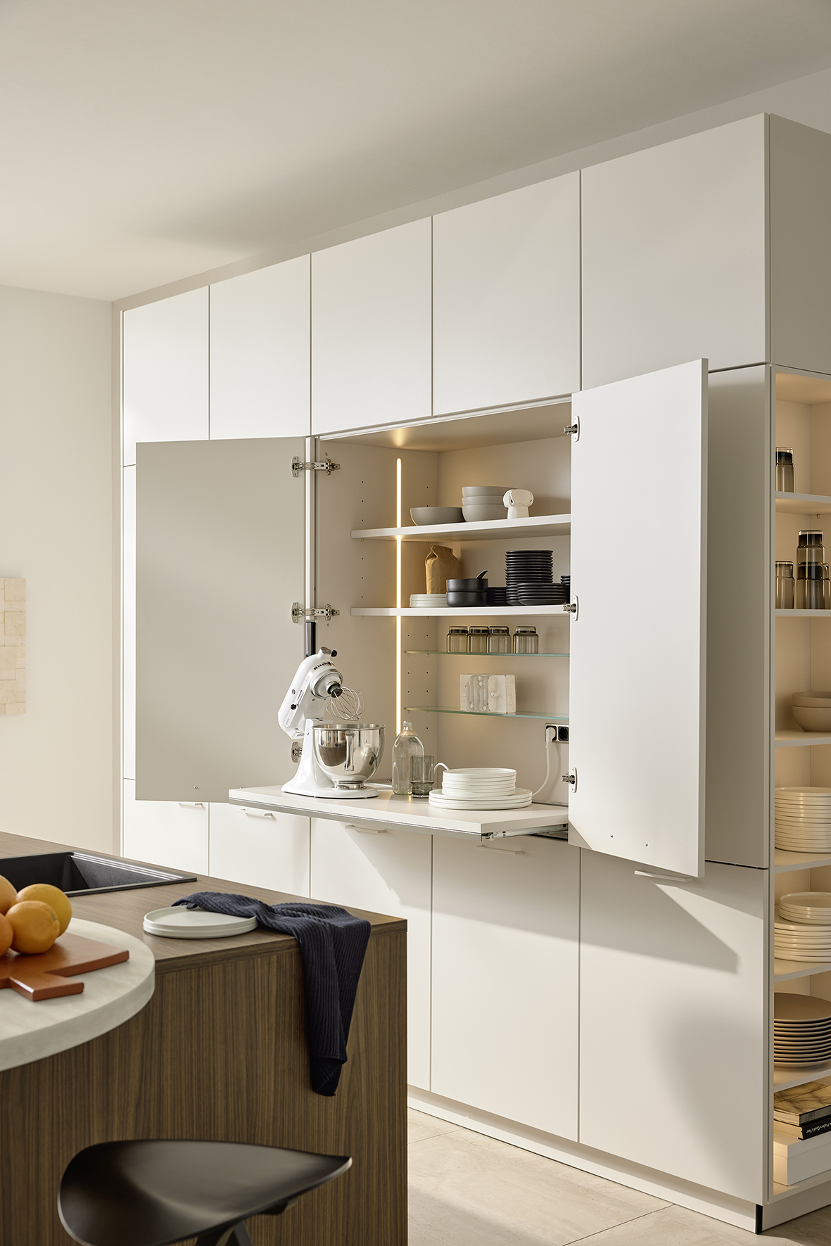 Komfortabel verstauen lassen sich Küchengeräte auch in Aufsatzschränken, die direkt auf der Arbeitsplatte stehen. Diese Schränke sind in Breite und Tiefe so konzipiert, dass sie selbst große Modelle aufnehmen können. Die Geräte werden aus dem Schrank nach vorne auf die Arbeitsplatte geschoben. Die Türen lassen sich meist falten oder nach oben klappen, so dass sie während der Nutzung nicht im Weg stehen. Eine weitere Möglichkeit bieten Rollladenschränke oder die sogenannten „Pocket-Doors“, die sich öffnen und dann in die Seitenwände schieben lassen.