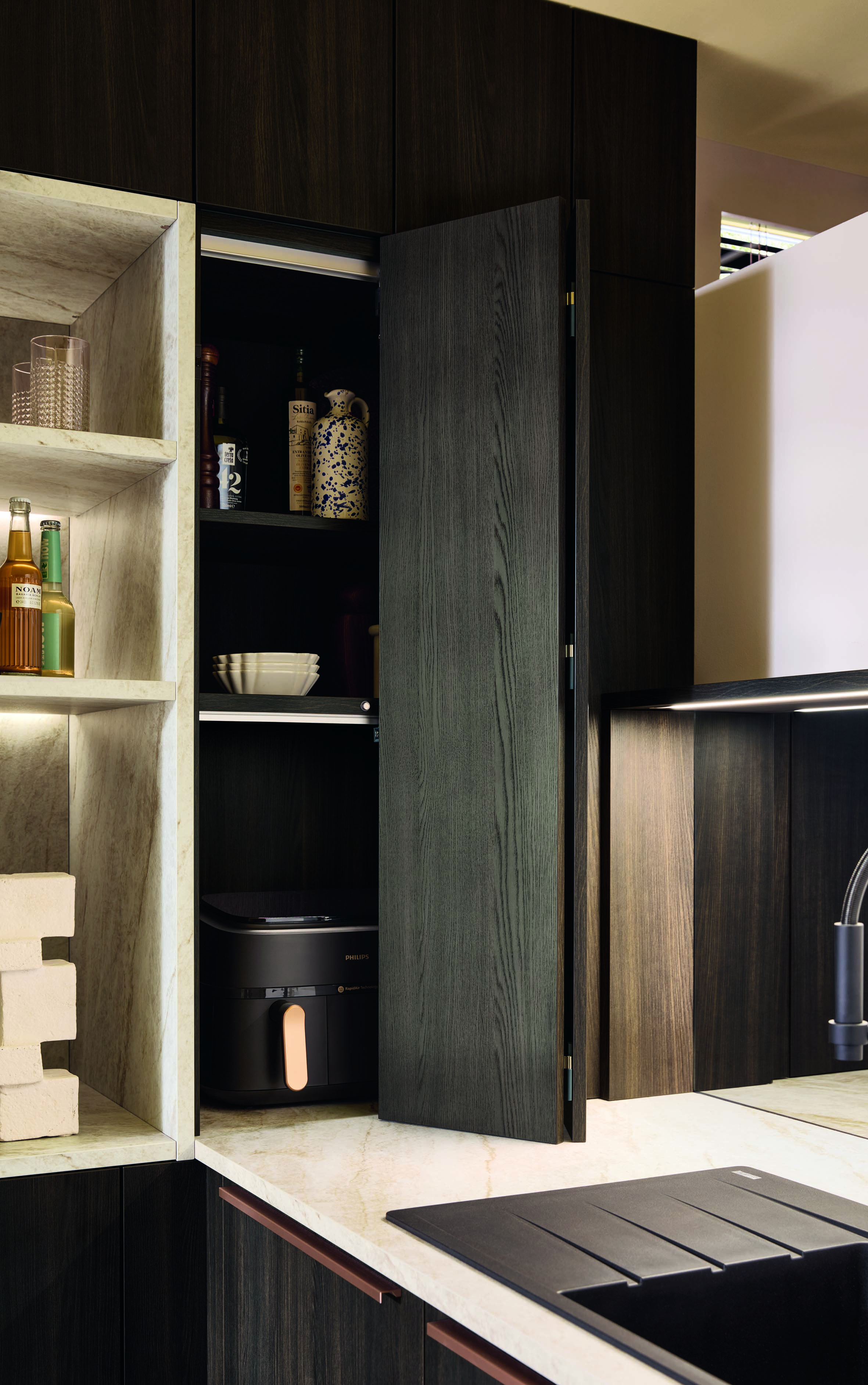 Foto 7: Hinter der Drehtür verbirgt sich ein funktional konzipierter Innenauszug mit integrierter Metallwanne,