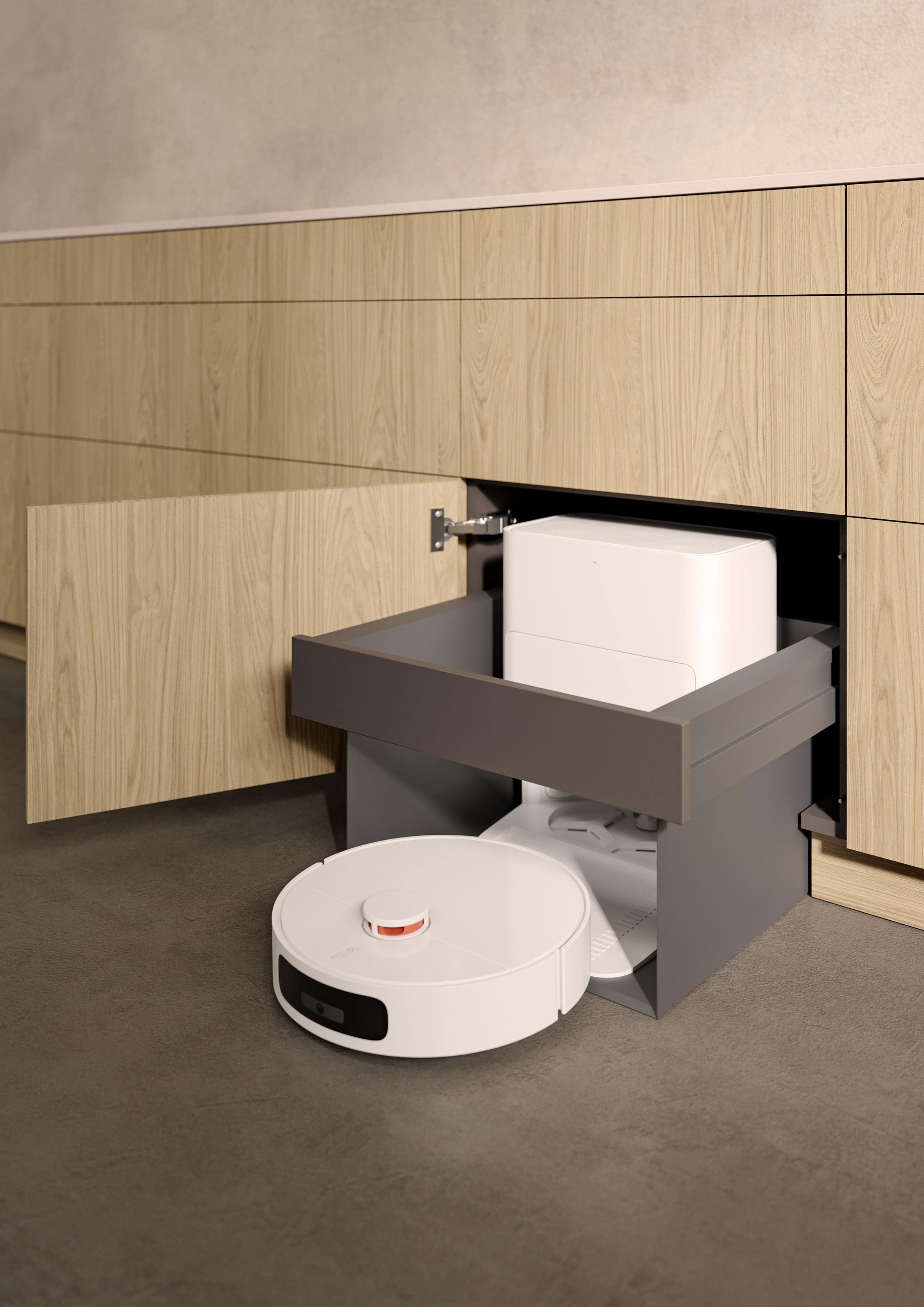 Dank eines eigens entwickelten Schrankelements lässt sich selbst ein Saugroboter in der Küche unterbringen. Von außen sichtbar ist nur die Aussparung an der Sockelleiste, durch die der Roboter zu seiner Ladestation gelangt. Hinter der darüberliegenden Drehtür verbirgt sich ein funktional konzipierter Innenauszug mit integrierter Metallwanne, in die der Roboter über eine Rampe im Sockelausschnitt ein- und ausfahren kann. So können Staub oder Schmutz nicht nach außen gelangen. Zugleich bleibt die Ladestation für Reinigungs- und Wartungsarbeiten zugänglich.