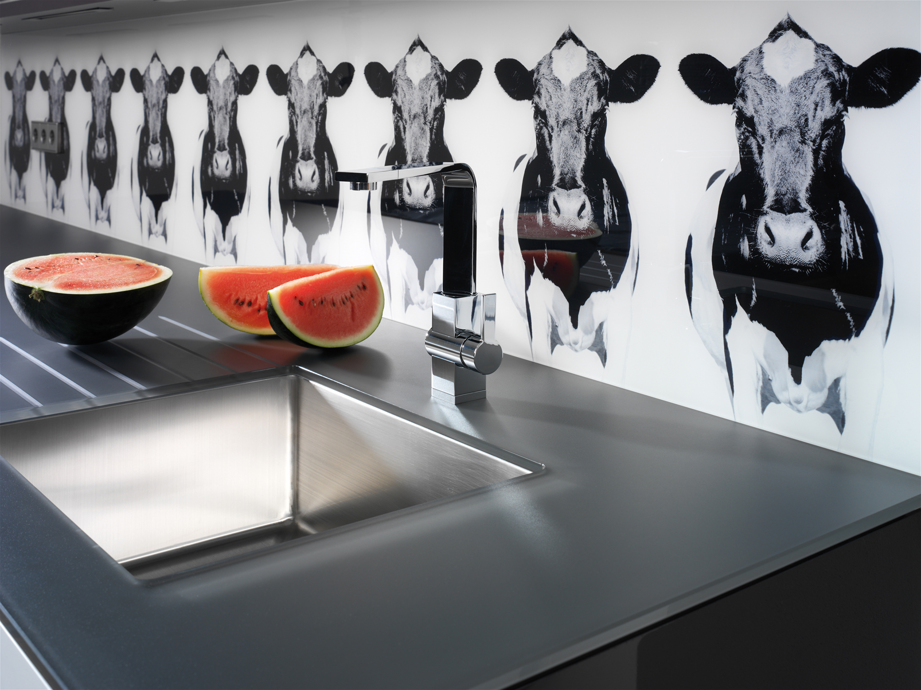 Foto 3: Spezielle Drucktechniken oder rĂĽckseitige Farblackierungen machen Glasarbeitsplatten zu einem favorisierten Werkstoff in der KĂĽche. (Foto: AMK)