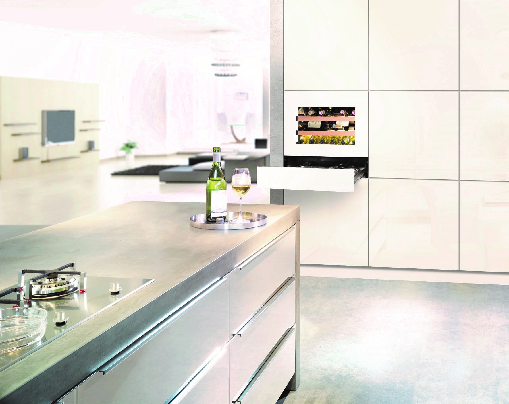 Wein stilvoll temperieren und präsentieren: z. B. mit einem grifflosen Einbau-Weintemperierschrank im Kompaktformat. Die Glastür öffnet sich durch leichtes Antippen wie von Zauberhand. Das Sommelier-Zubehör kommt in die Zubehörschublade. (Foto: AMK)