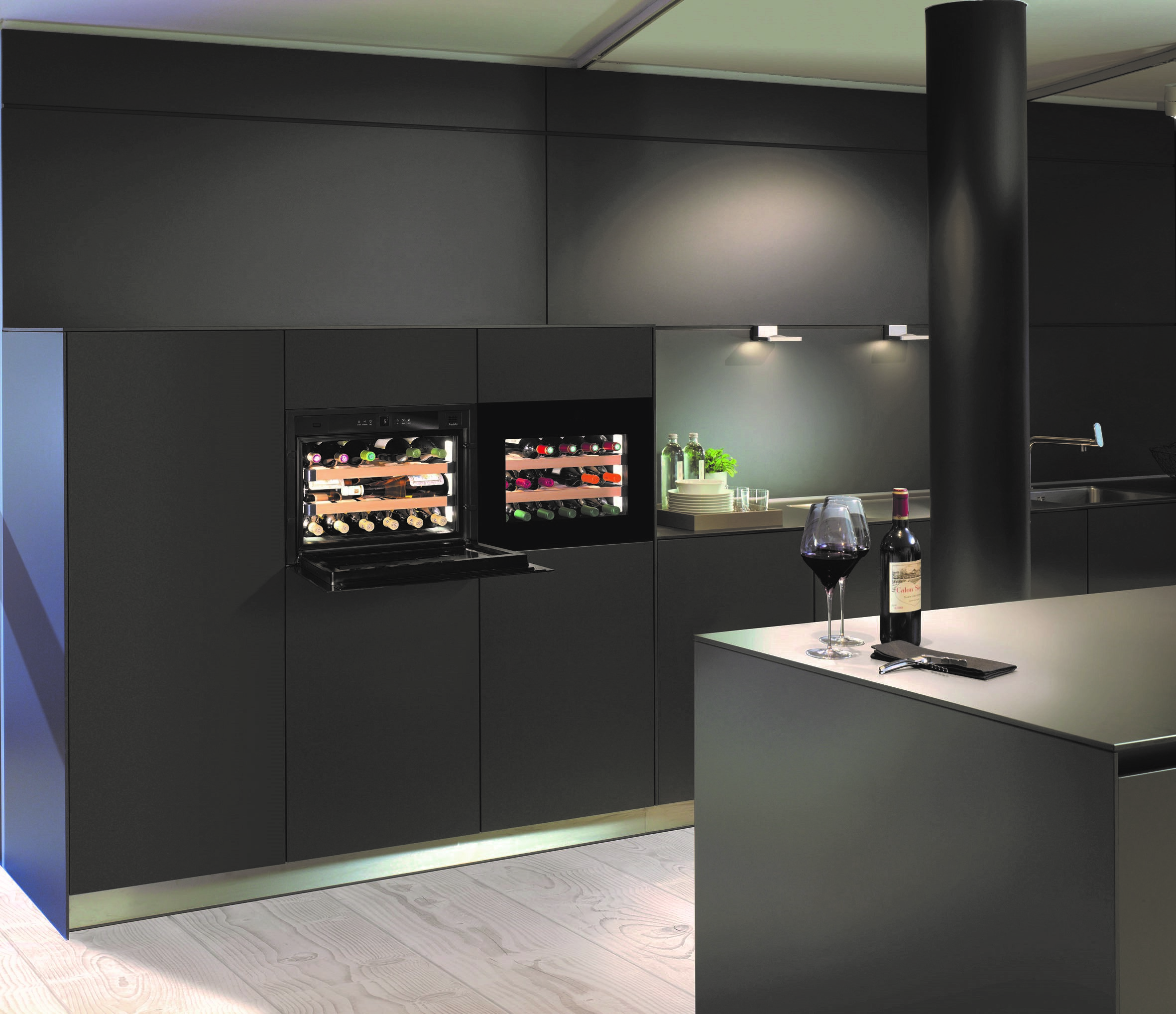 Eine Serie schwarzer Kompaktgeräte für 45 cm hohe Möbelnischen lässt sich perfekt mit einem kompakten Einbau-Weinschrank in schwarzem Glas komplettieren. Oder für einen doppelten Wein- und Champagnervorrat gleich mit zwei Geräten. (Foto: AMK)