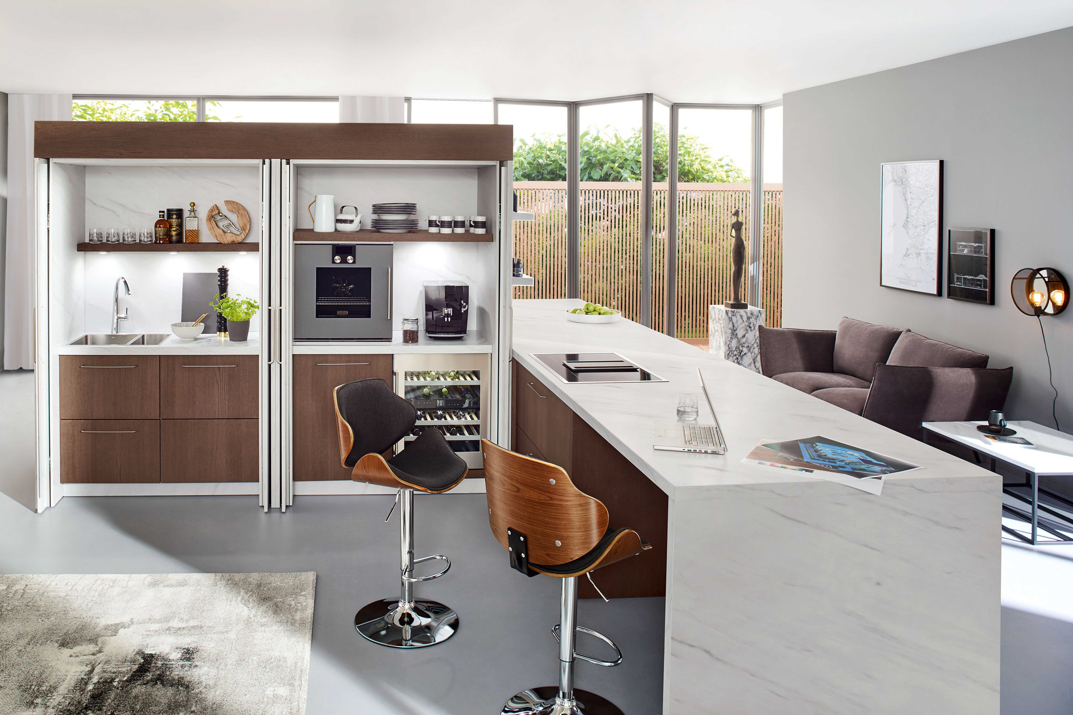 Foto 4: Modulares Raumkonzept zum Kochen, Genießen, Relaxen und Arbeiten in Marmor-Optik und echter Eiche. Alles, was man zur Essenszubereitung benötigt, ist in zwei Multifunktionsschränken mit Einschubtüren (Pocket Doors) und der angegliederten Kochtheke untergebracht. (Foto: AMK)