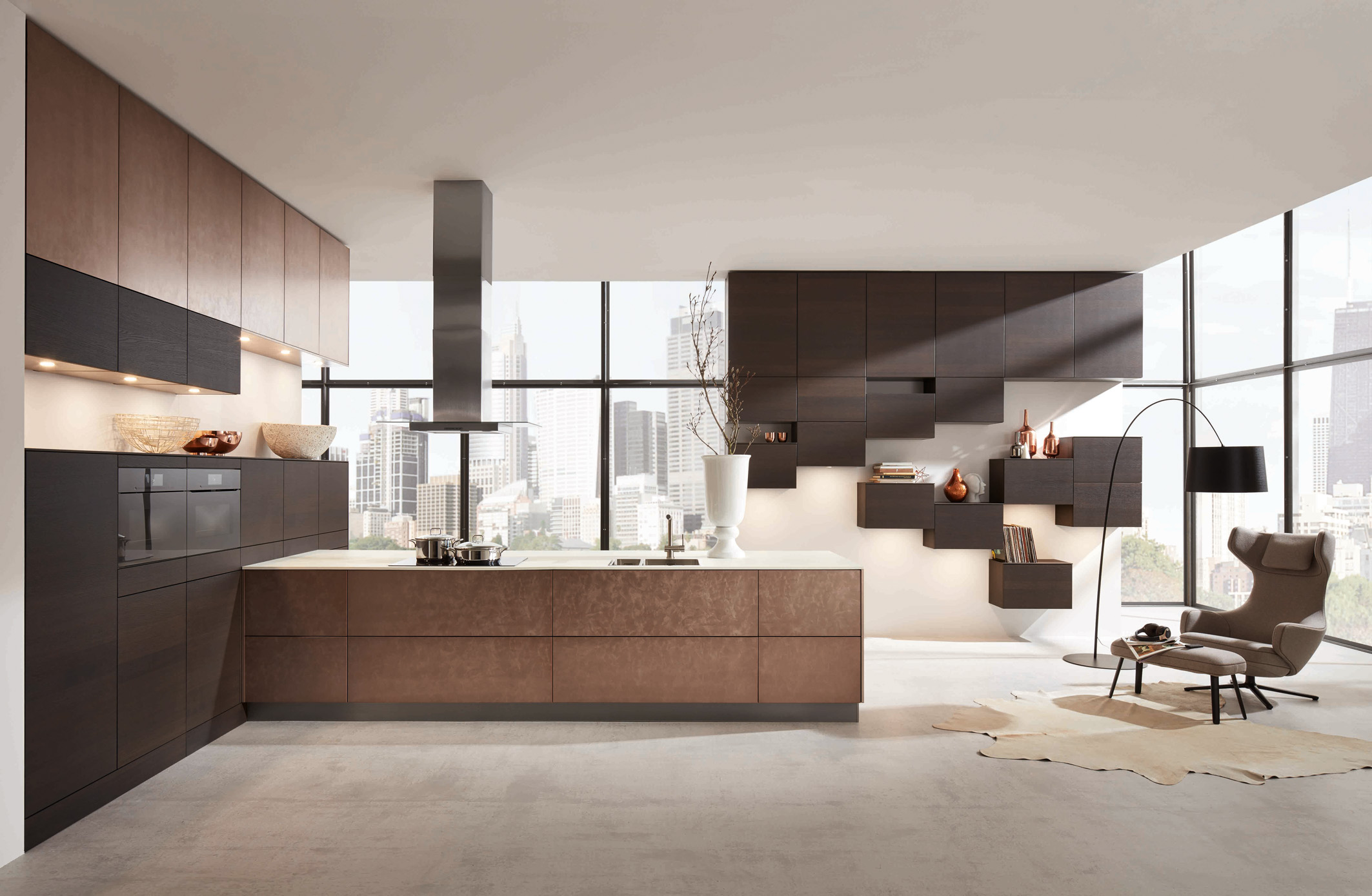 Einen fließenden Übergang ermöglichen Ess-Lösungen rund um die Kücheninsel. Wenn der Kochblock mit einer Theke samt Sitzgelegenheit versehen wird, entwickelt sich die Küche vom Funktionsraum zum geselligen Treffpunkt der Wohnung. Aber auch lange Esstische, an denen mit der Familie oder Freunden gespeist wird, werden oftmals direkt an die Kochstation angedockt. Versehen sind sie häufig mit Sitzbänken oder Ess-Sesseln, die für eine gemütliche Atmosphäre sorgen. Für einen stimmigen Übergang vom Kochen zum Wohnen eignen sich ebenfalls großflächige Wandelemente in furniertem oder tiefgeprägtem Holz.