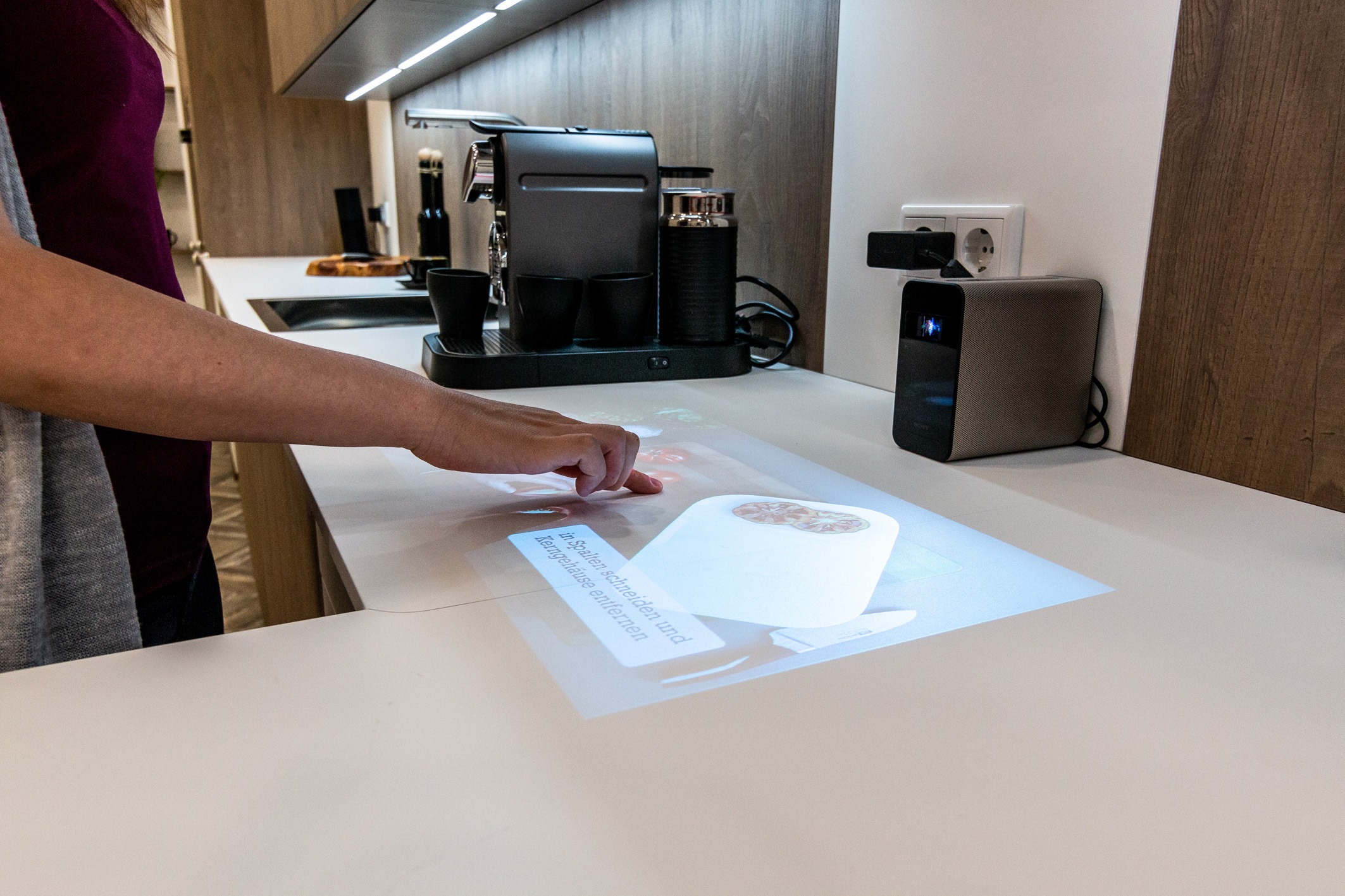 Ein mobiler Beamer erlaubt den Zugriff auf Rezepte und Informationen aus dem Internet. Die Schaltflächen werden beispielsweise auf die Küchenarbeitsplatte projiziert und dort einfach mit Gesten gesteuert. (AMK)