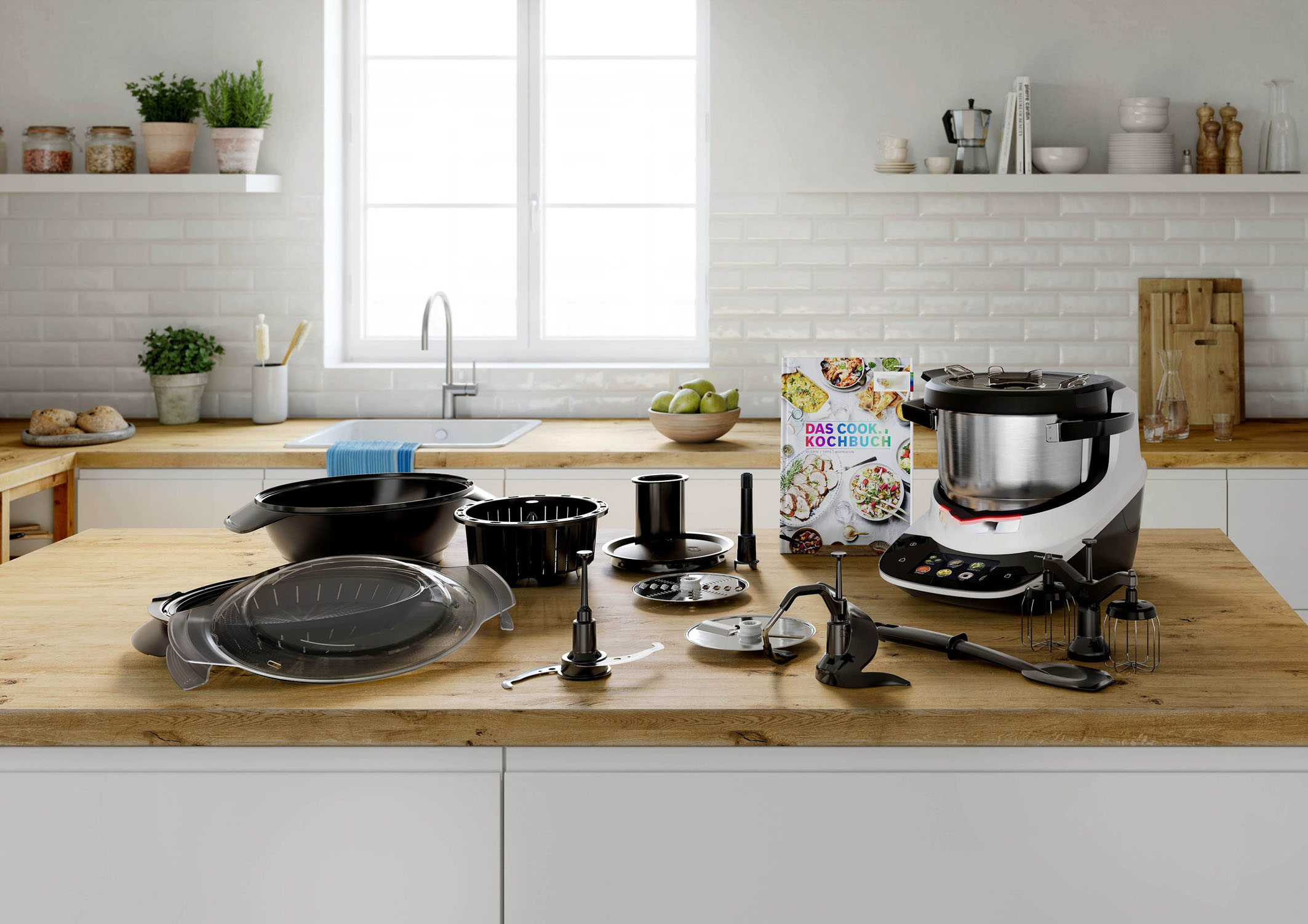 Multifunktionale Küchenmaschine mit vielen Funktionen – auch zum Kochen, Anbraten und Dampfgaren. Nutzer können unter drei Modi wählen (manuell, 24 Automatikprogramme, Kochen mit Anleitung) und sieben mitgelieferten, professionellen Werkzeugen und Zubehörelementen. (Foto: AMK)