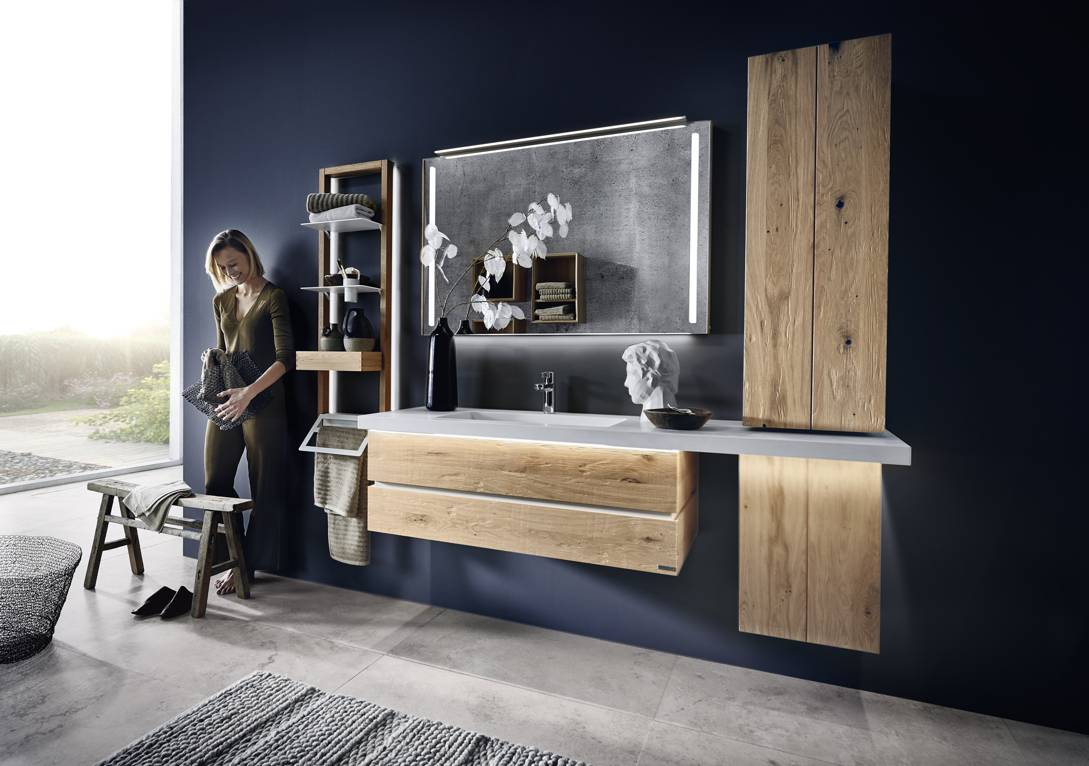 Die natürlichen Strukturen und Farben von Holz strahlen eine Wärme aus, die jeder objektiv fühlen kann. Denn Holz ist ein schwacher Wärmeleiter, der die Körperwärme bei Berührungen zurückgibt. Genau dies löst ein spürbares Wärmegefühl aus – und gerade im Badezimmer ist Wärme schließlich gefragt. Für viele Menschen soll das Bad heute ein Ort der Entspannung sein und eher einer Wellness-Oase gleichen denn einem funktionalen Waschraum. Massivholzmöbel sind hier die passende Lösung für optische und haptische Wärme. Zumal sie dank natürlicher Materialkompetenz und hochwertiger Verarbeitung etwaige Belastungen durch hohe Luftfeuchtigkeit, Spritzwasser & Co. problemlos bewältigen.