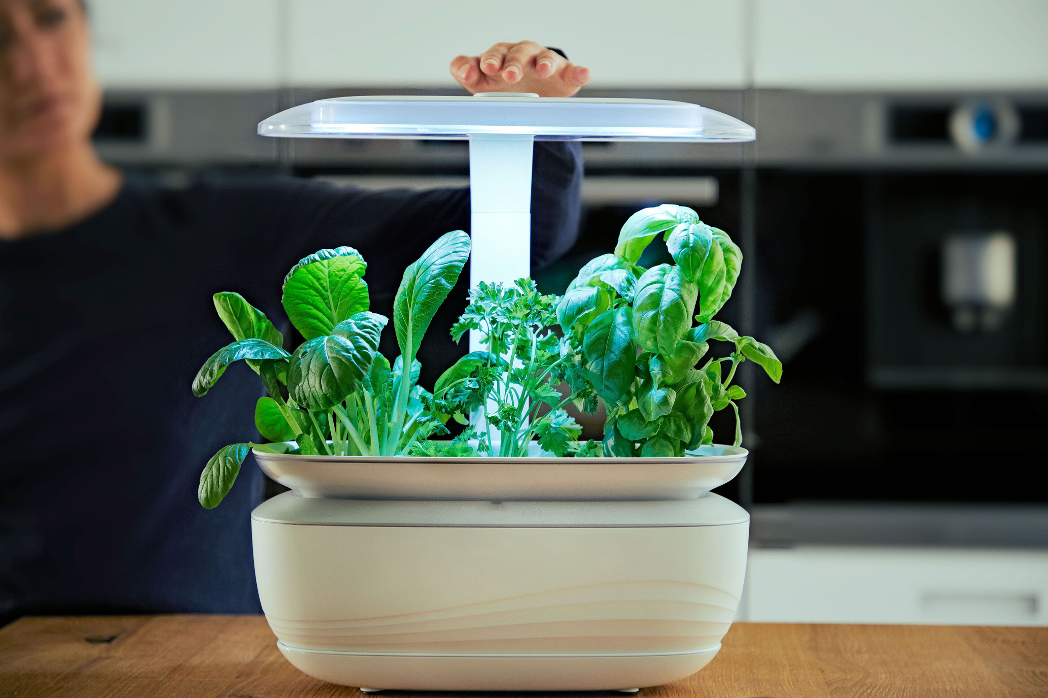 Auch in kleinen Indoor-Pflanzgärten lassen sich Kräuter und andere essbare Pflanzen in der heimischen Küche züchten. Das Gerät wird mit einer Nährstofflösung sowie mit vorgefertigten Samenkapseln aus Steinwolle bestückt. Darauf wird eine Haube mit einem automatisierten LED-Beleuchtungssystem gesetzt. Eine kleine Pumpe sorgt für die Bewässerung. Wenn die Pflanzen zu wachsen beginnen, fährt die Haube entsprechend in die Höhe. Bei guter Pflege können die Kräuter über einen längeren Zeitraum geerntet werden – vorausgesetzt, es wird nicht zu viel auf einmal abgeerntet.
