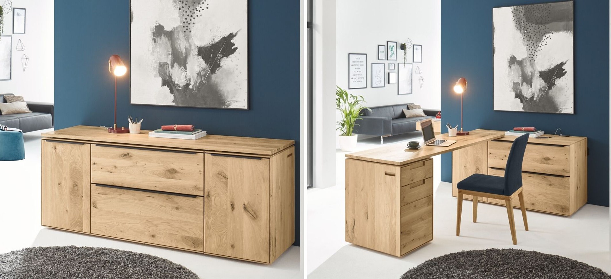 Der klassische Sekretär für das Wohnzimmer kann hierbei eine passende Lösung sein. Er kommt mit nur wenig Platz aus und die erweiterbare Arbeitsfläche kann kinderleicht ins Möbelstück eingeschoben werden. Eine weitere ausgeklügelte Lösung stellt ein neuentwickeltes Sideboard von Decker dar. Mit nur wenigen Handgriffen kann aus einem klassisch anmutenden Sideboard für das Wohnzimmer eine geeignete Arbeitsfläche für das Homeoffice geschaffen werden. Das dreigliederige Möbelstück wird durch Verschieben eines Korpusses, an welchem die Schreibtischplatte befestigt ist, ausgezogen und so kurzerhand zum Schreibtisch umfunktioniert. Zum Feierabend kann das Element dann einfach wieder zusammengeschoben werden, sodass vom Arbeitsalltag nichts mehr zu sehen ist. „Das bietet Nutzern immense Flexibilität in einem attraktiven Design“, sagt Andreas Decker, Geschäftsführer und Mitglied der IPM. Zudem bietet das Sideboard viel Staufläche für Akten sowie Unterlagen und selbst die Elektrogeräte lassen sich in den Schränken verstauen. Damit passt sich das Massivholzmöbel der gewünschten Wohnsituation harmonisch an und ist räumlich sowie optisch integrierbar. „Das Arbeiten im Homeoffice kann damit nicht nur sehr gut funktionieren, sondern auch toll aussehen“, verspricht der ostwestfälische Massivholzspezialist und ergänzt: „Eine nachhaltige Fertigung entlang der kompletten Wertschöpfungskette ist selbstverständlich auch bei den Homeoffice-Möbeln gegeben, wie es für all unsere Möbel gilt.“