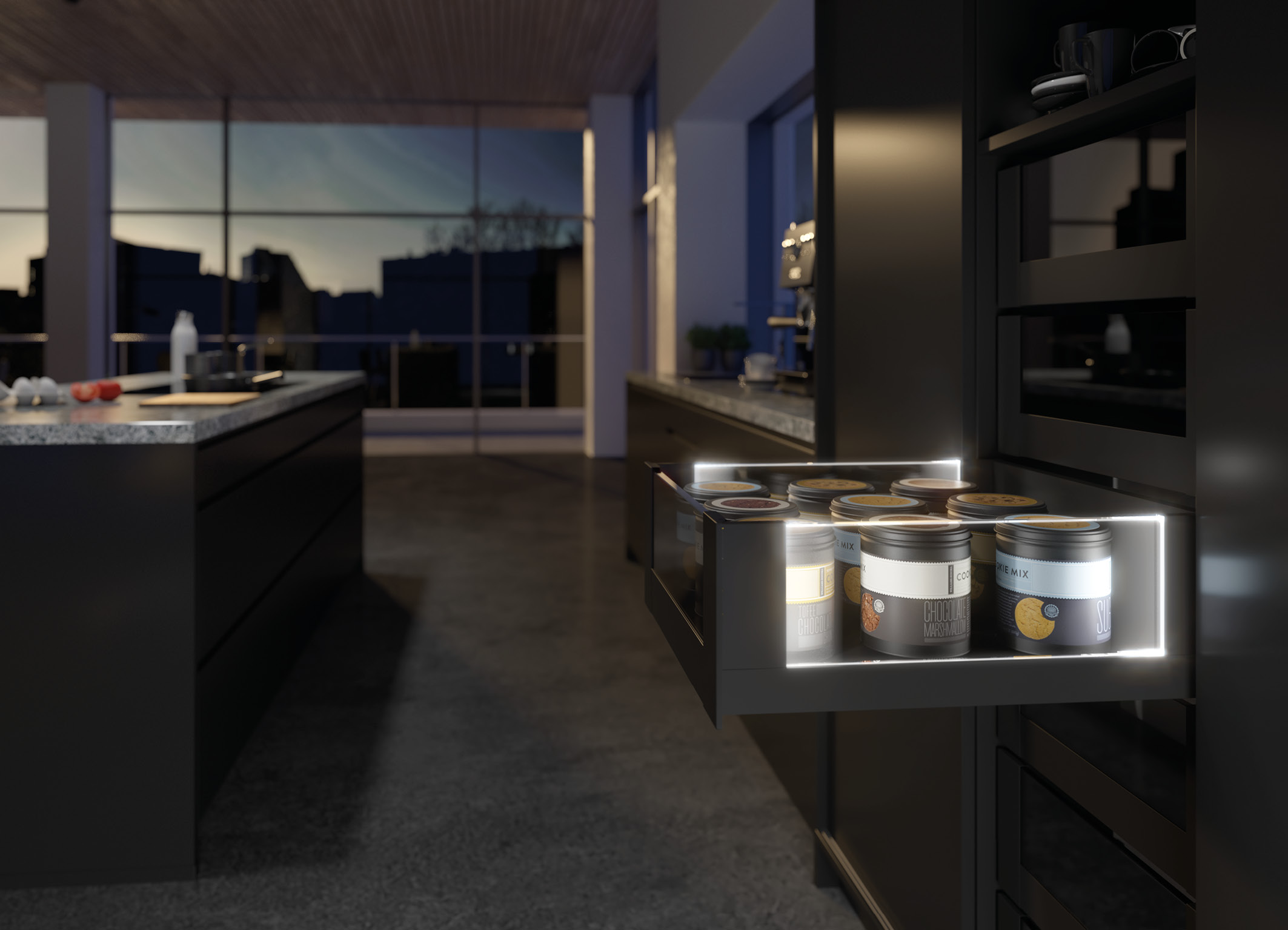 Bis hin zum individualisierbaren Schubkasten in Deluxe-Ausführung mit spektakulären optischen Effekten – z. B. Licht- und Transparenzeffekten mittels LED-Designprofilen oder Glas-Zargen mit beleuchteten Glas-Inlays. Damit können die geöffneten Schubkästen dann indirekt und nutzungsorientiert nach innen beleuchtet oder besondere Lichtakzente nach außen gesetzt werden. Die nötige Energie zu dieser neuen Form der Schubkasten-Illumination liefert jeweils ein wiederaufladbares Akku-Pack. Aufwendige Elektroanschlüsse sind nicht nötig, denn die Aufladung erfolgt per Handy-Ladegerät mit USB-Anschluss.