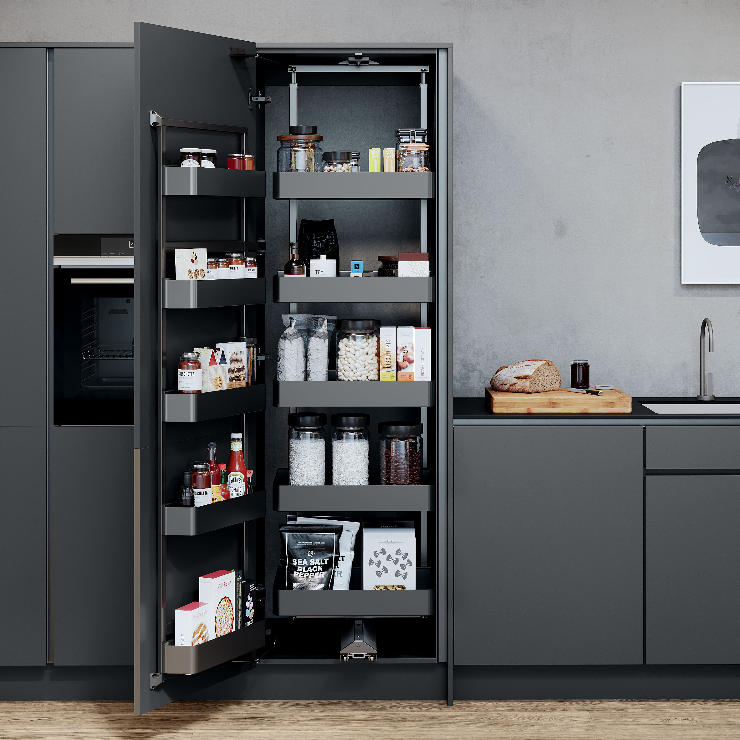 Zu den wichtigsten und größten Stauraumwundern in jeder Küche zählen Hochschränke, die in verschiedensten Höhen und Breiten und mit vielen intelligenten Auszugs- und Ausstattungsoptionen angeboten werden. Zum übersichtlichen Lagern trockener Lebensmittel sind vor allem Vorratsschrankauszüge aus der Küche nicht mehr wegzudenken. Die Systembeschläge bieten formschöne und großflächige Ablagemöglichkeiten. So erfüllen sie sämtliche Anforderungen an komfortable Stauraumlösungen – von der Slim- bis zur XXL-Lösung, wenn z. B. zwei Vorratsschränke nebeneinander geplant werden.