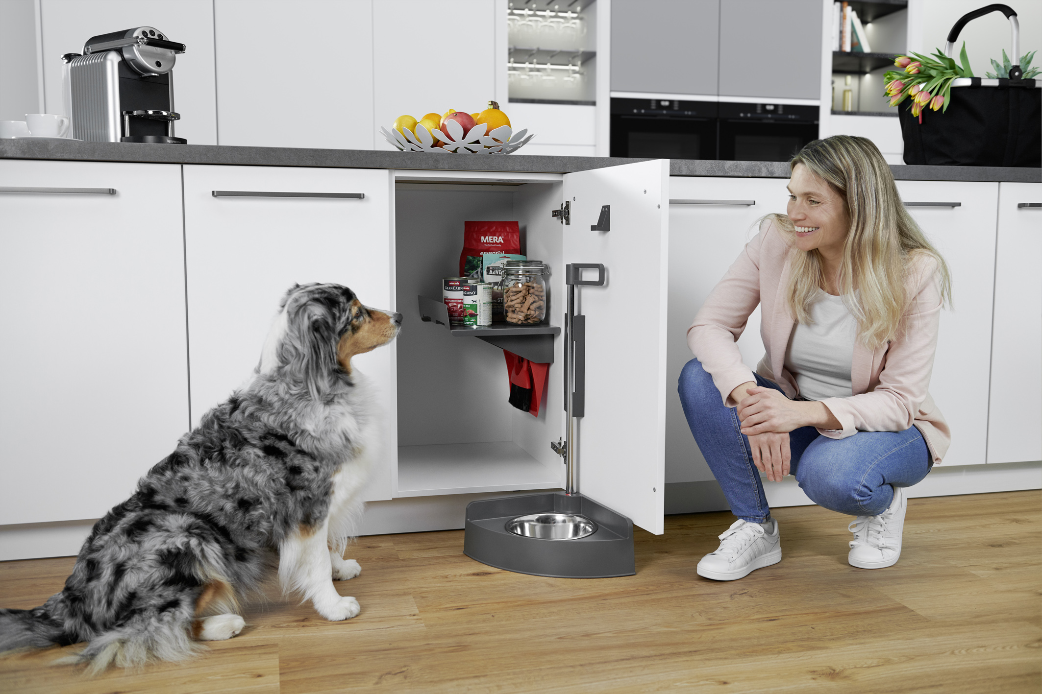 Ordentlich und hygienisch verstauen & bevorraten – das wünschen sich viele Menschen, wenn es um die Versorgung und Pflege ihrer Haustiere geht. Eine pfiffige Einbaulösung für (Wohn)Küchen und Hauswirtschaftsräume ist die mobile Futterstation für Hunde und Katzen mit ein oder zwei Näpfen, die einfach in einen Unterschrank integriert wird. Nach dem Öffnen der Tür lässt sie sich auf den Boden absenken und nach Beendigung der Fütterung wieder hochziehen und wegklappen. Da die Futterstation zudem mit einer Ein- & Aushängefunktion und einem Tragegriff ausgestattet ist, kann die gesamte Einheit mühelos abgenommen und auch an einer anderen Stelle abgestellt werden. Ergänzend hierzu gibt es noch diverse Ordnungsmodule. Damit ist dann nicht nur das Futter zentral und übersichtlich verstaut, sondern auch noch das gesamte Hunde-&-Katzen-Equipment (z. B. Bürste, Kamm, Krallenschere, Leine, Impfpass). Â