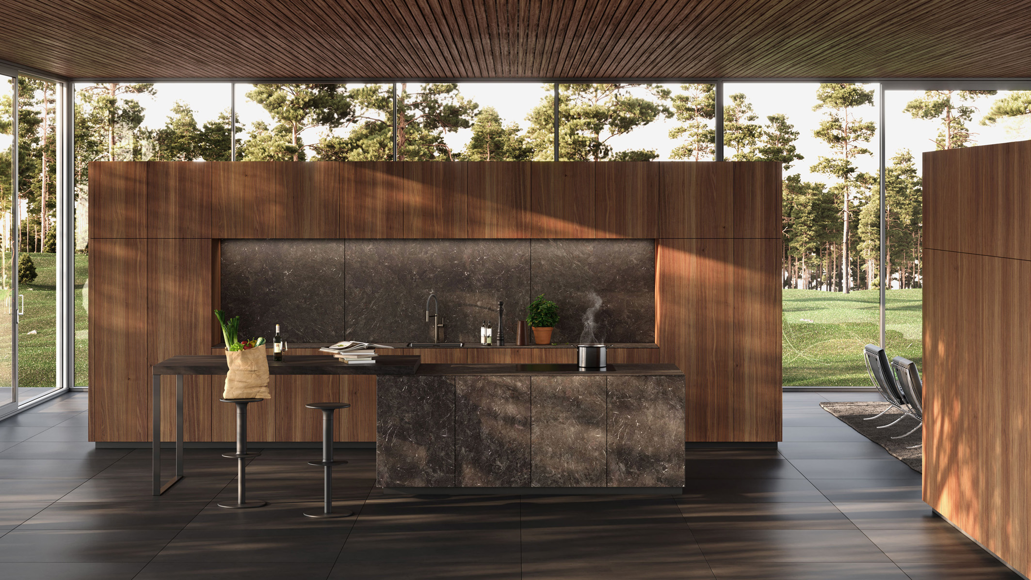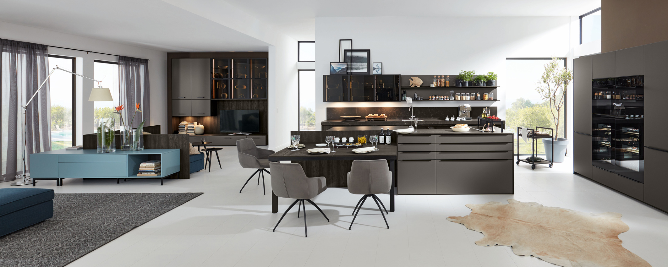 Die Premiumklasse setzt auf elegante Oberflächenprogramme in feinstem Echtholz – in der Tradition des Schreinerhandwerks – und in Kombination mit hochwertiger Keramik. Solche Design-Wohnküchen setzen Statements. Darüber hinaus sind sie so konzipiert, dass auch individuelle, raumübergreifende Innenausbaukonzepte damit möglich sind: Über Kochen und Essen hinaus auch für Wohnräume, Flure, Treppenhäuser und andere Bereiche. Die hohe äußere Ästhetik setzt sich ebenso beim Innenleben fort, das in einem eleganten Dunkelgrau gehalten ist – vom Korpus bis zu den Schubkästen, Auszügen, Besteckeinsätzen und dem Abfalltrennsystem.