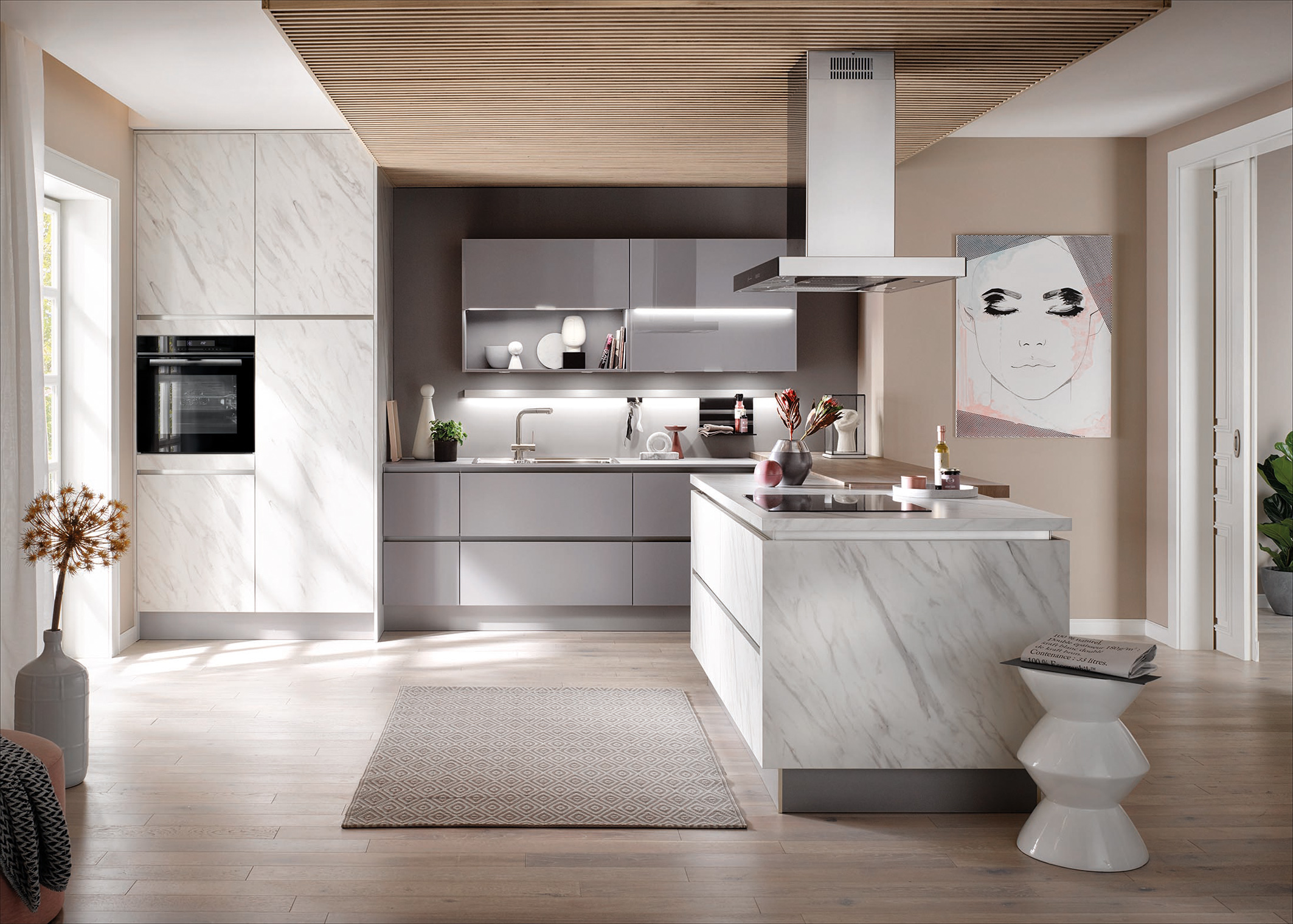 Einen Hauch von Luxus und Opulenz zaubern edle Steindekore in jede Wohnküche, z. B. grifflose Fronten in schicker, zeitloser Marmor-Optik und mit viel Liebe zum Detail. Sie sehen nicht nur gut aus, sondern fassen sich auch so an. Zudem sind die wertigen Oberflächen beständig, sehr pflegeleicht und dazu auch noch hygienisch, denn sie wirken antibakteriell.