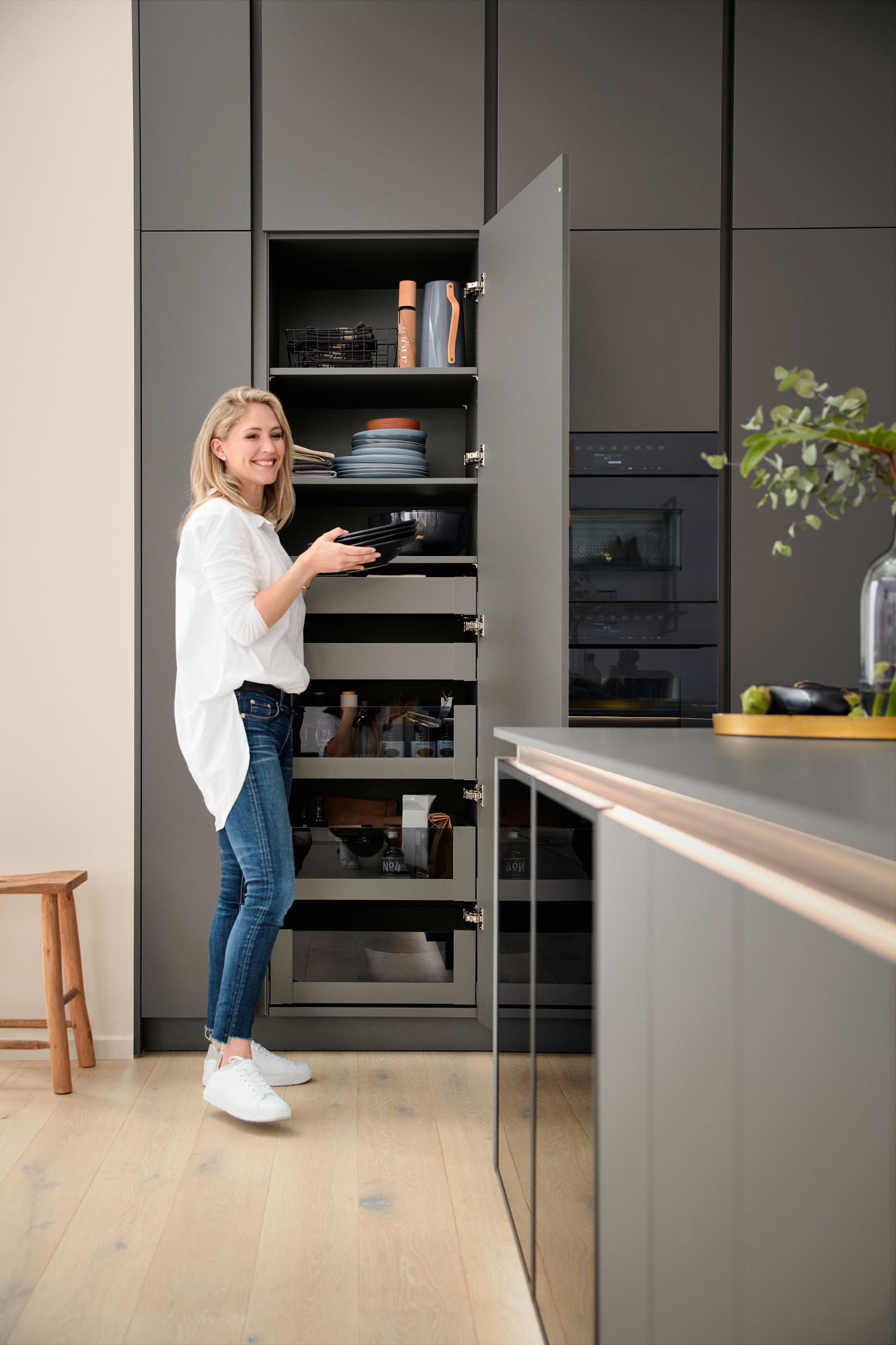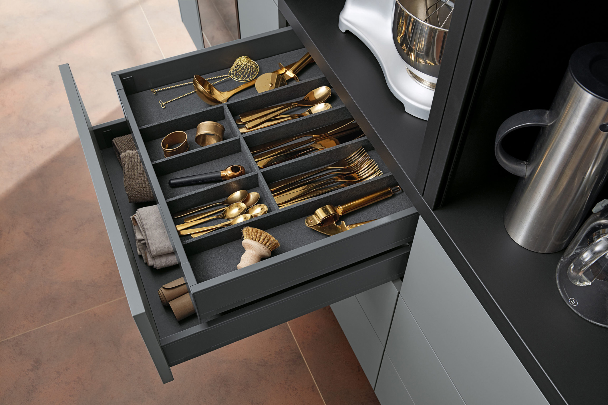 Wem ein modern-griffloses, minimalistisches Küchendesign gefällt, vielleicht vom ZEN-Buddhismus inspiriert und so aufs Wesentliche konzentriert, der wird sich auch dessen Fortsetzung hinter den Fronten wünschen. Schöne, schlichte Formen und klare Strukturen schaffen eine ruhige und entspannende Atmosphäre als Gegenpol zu einem hochautomatisierten Lebensstil mit äußeren Reizen to the Max. Hier gilt: Zur Ruhe kommen durch eine befreiende Klarheit und Ordnung – außen wie innen. Beispielsweise mittels einer hochfunktionalen Innenausstattung und einem konsequenten Farbverbund bei jedem noch so winzigen Detail: bei den Beschlägen und Abdeckkappen, bei den Hoch-, Ober-, Unter- und Eckschränken, allen Schubkästen und Auszügen mit ihren hochwertigen Organisationssystemen bis hin zum optisch angepassten Spülcenter und Mülltrennsystem.Â