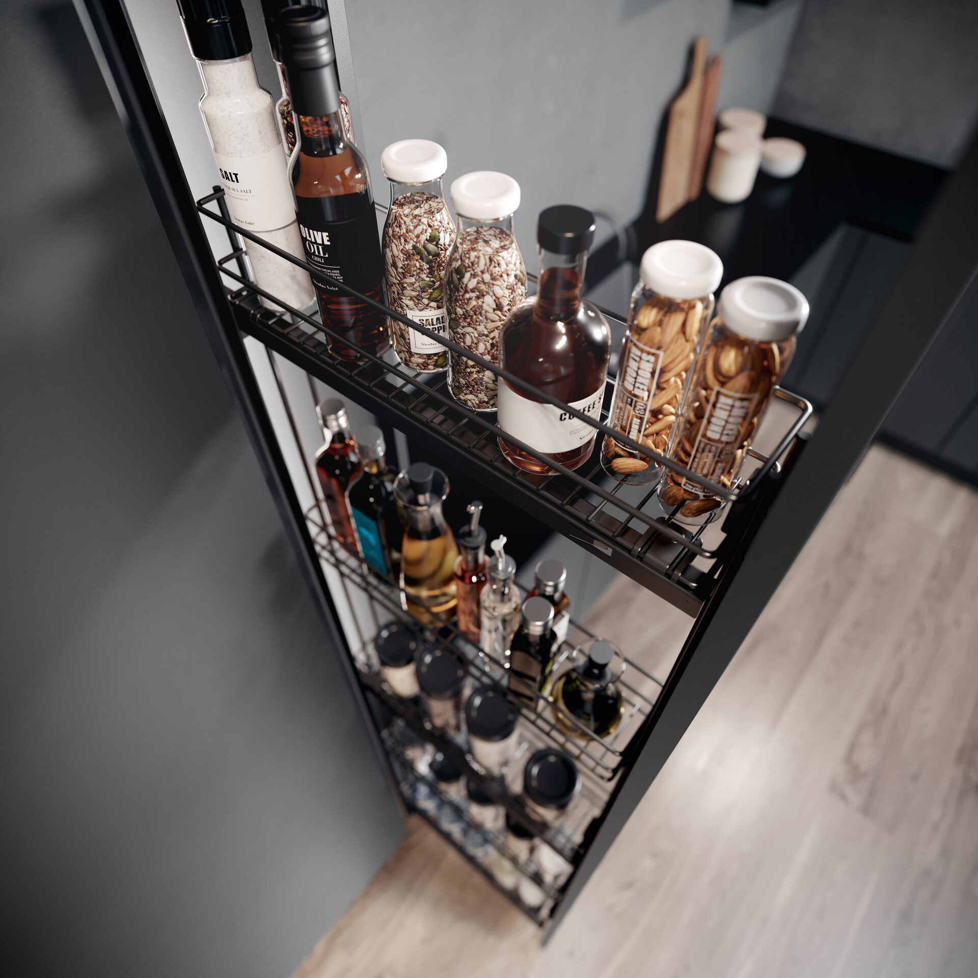 In einer kreativen Hobby-Werkstatt-Küche, in der man seiner Koch-, Back-, Gar- und Grill-Leidenschaft ausgiebig und experimentell frönt, geht es dynamisch her. Das täglich verwendete, meist professionelle Equipment soll unmittelbar zugänglich sein – die Lebensmittelvorräte werden so verstaut, dass alles schnell zur Hand ist. „Die Hobby-Werkstatt-Küche inspiriert. Eine lustvolle Kreativität, die aus dem Unfertigen und Potenziellen entspringt, steht hier im Mittelpunkt“, sagt AMK-Geschäftsführer Volker Irle. Sie ist robust und widerstandsfähig, das gilt auch für die Innenausstattung. Ein Beispiel hierfür sind Hoch- und Vorratsschränke mit stark belastbaren Auszügen, in denen voller Überblick über das Lagergut herrscht.