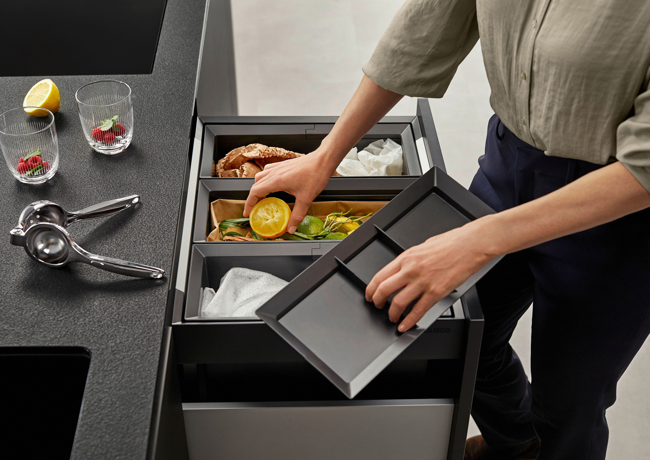 Wo der Wunsch nach bunter Abwechslung und lebendiger Vielfalt besteht, sind offene und modular gestaltete Wohnküchen beliebt, zumal wenn öfter auch mal ein Ortswechsel ansteht. „Wohnen in der Stadt bzw. ein moderner urbaner Lebensstil rückt Themen wie nachhaltiges Handeln und Wohnen auf wenig(er) Raum ohne Verzicht auf Komfort in den Fokus, bei dem der zur Verfügung stehende Platz optimal genutzt wird“, erläutert Volker Irle. Dies spiegelt sich in pflegeleichten Oberflächen, platzsparenden und besonders nachhaltigen Produkten wider: z. B. offenen Regalsystemen. Einem kompakten Abfalltrennsystem, das sich in, unter einer Schublade oder direkt unter der Arbeitsplatte befindet. Sowie extra nachhaltigen Schubkasten- und Auszugseinsätzen aus einem innovativen Naturfaser-Verbundwerkstoff. Er basiert zu fast 80 Prozent auf natürlichen Bastfasern (schnell nachwachsenden Gräsern wie Hanf und Kenaf) und zu rund einem Fünftel auf einem vernetzenden, auf Wasserbasis hergestellten formaldehyd- und phenolharzfreien duroplastischen Bindemittel mit hoher Umweltverträglichkeit.
