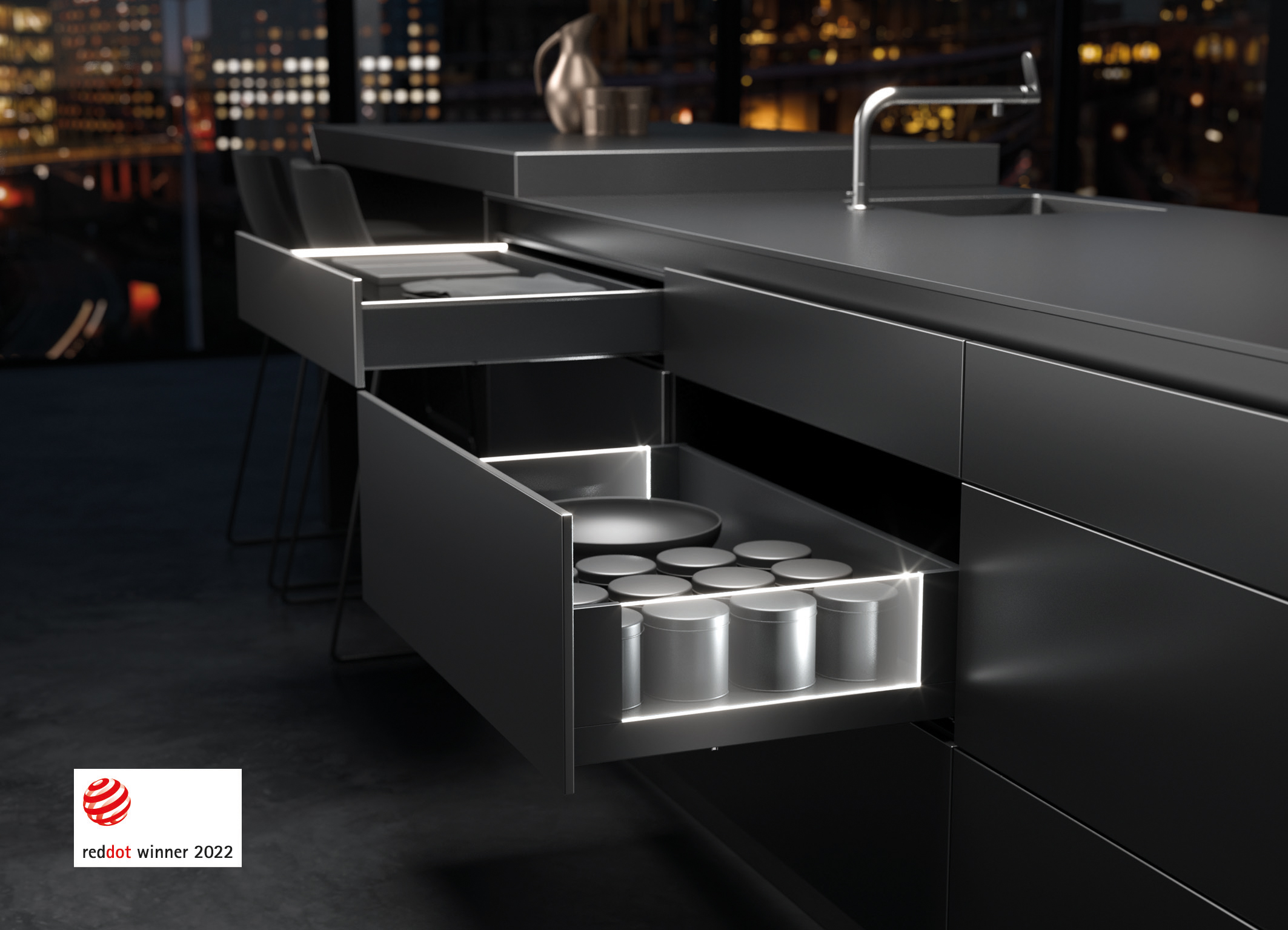 Exklusives für die Repräsentationsküche. Wer sich selbst und seine Gäste mit besonderen Details überraschen möchte, für den bieten sich individualisierbare Schubkästen mit Lichteffekten an. Das LED-Licht ist in Designprofile und Glas-Inlays mit polierter oder geschliffener Kante integriert. (Foto: AMK)