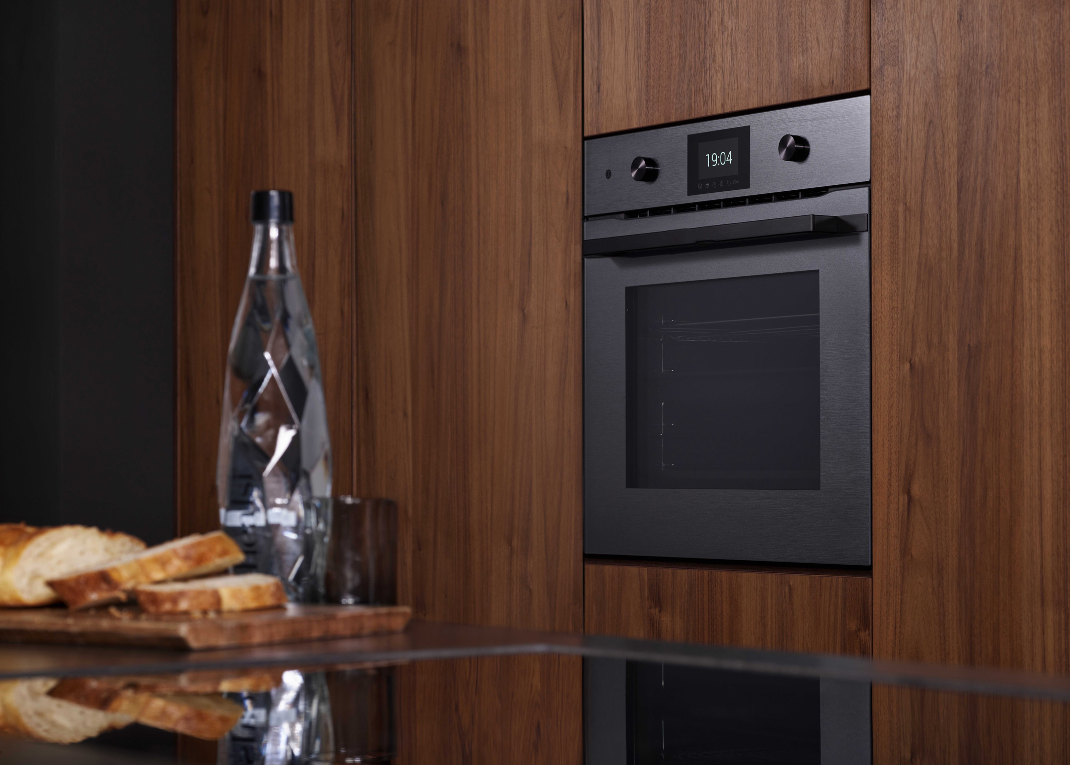 (Red Dot) In schwarzgrauem Graphit, einem edlen Rohstoff mit dezentem Glanz. Die hinter Glas gedruckte Struktur ähnelt gebürstetem Stahl. In Kombination mit dem mattschwarzen Griffdesign passt dieser Einbau-Backofen zu allen natürlichen Oberflächen in einer Lifestyle-Wohnküche. (Foto: AMK) Â